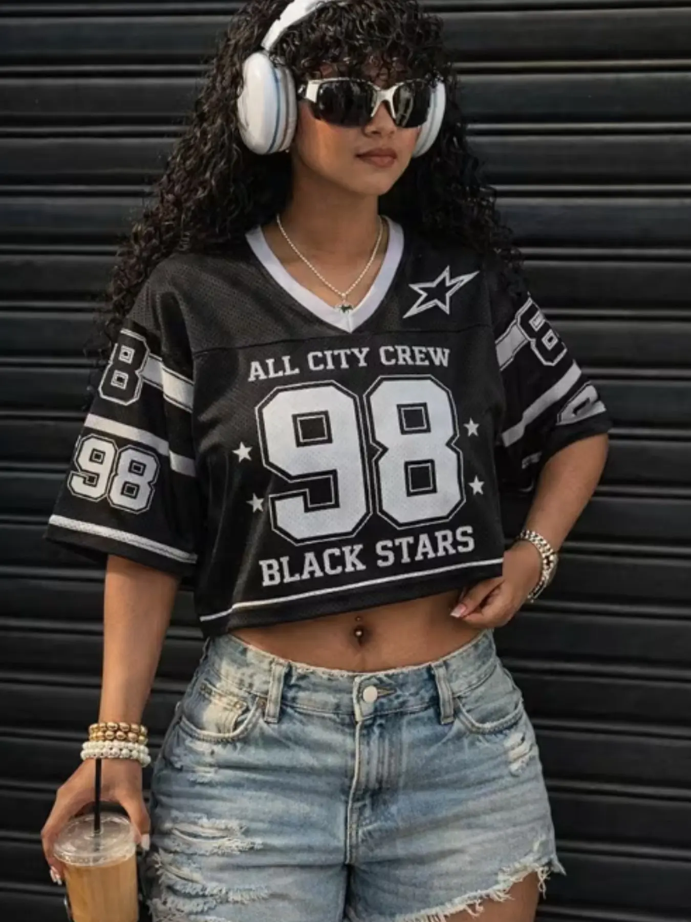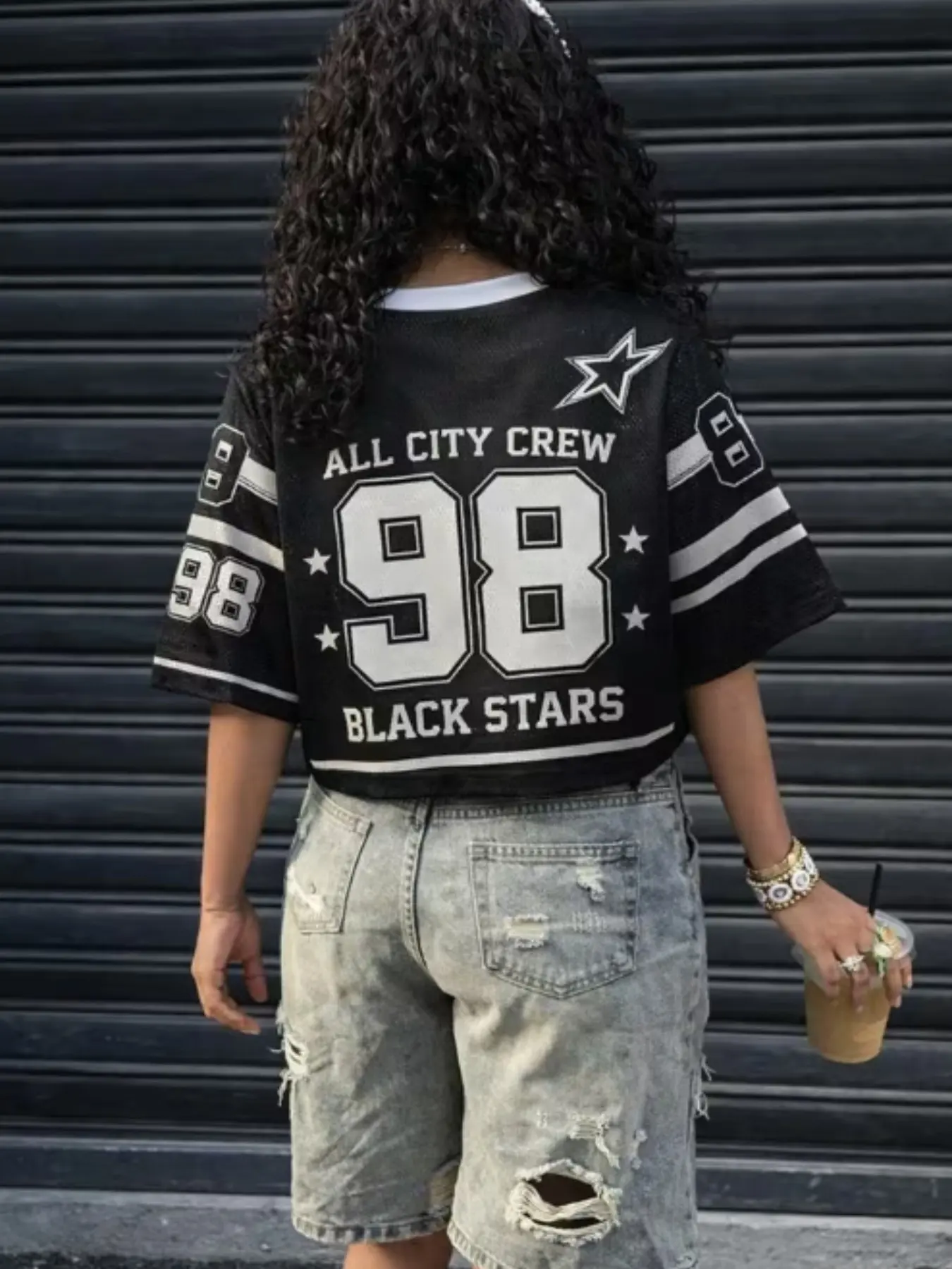Classic black-white color scheme + "ALL CITY CREW 98 BLACK STARS" star graphic, retro blokecore jersey style, perfect for 2026 summer streetwear looks.