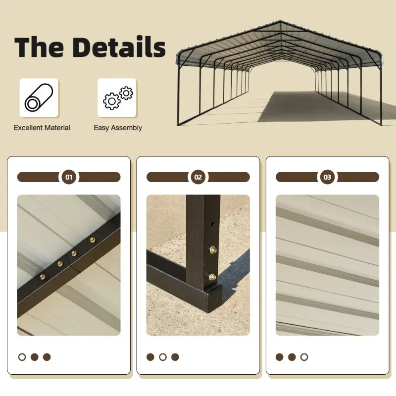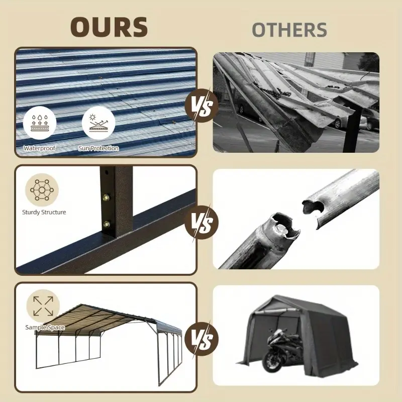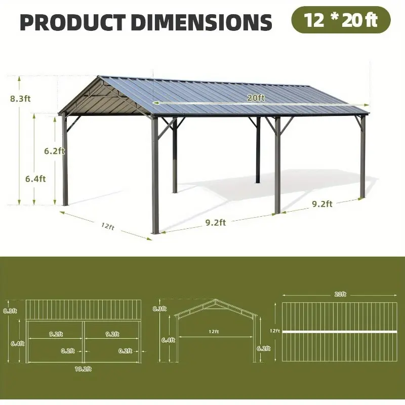 This metal carport offers ample space for cars, boats, and outdoor equipment, providing a versatile solution for your storage needs. Its high-quality galvanized steel roof provides excellent anti-rust and sun protection, ensuring reliable protection for your belongings.