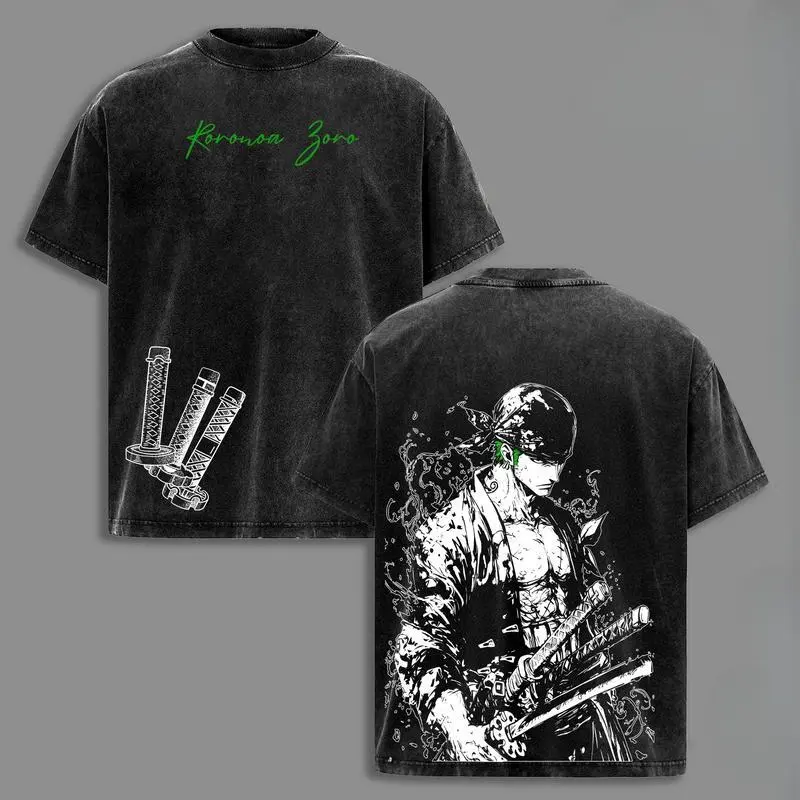 Roronoa Zoro T Shirt One Piece Anime Tee Three Sword Style Santoryu Graphic Top Vintage Washed Streetwear Green Aesthetic Wano Arc Oversized Unisex Casual Top Shonen Spirit Collection Retro Style Soft Cotton Daily Outfit