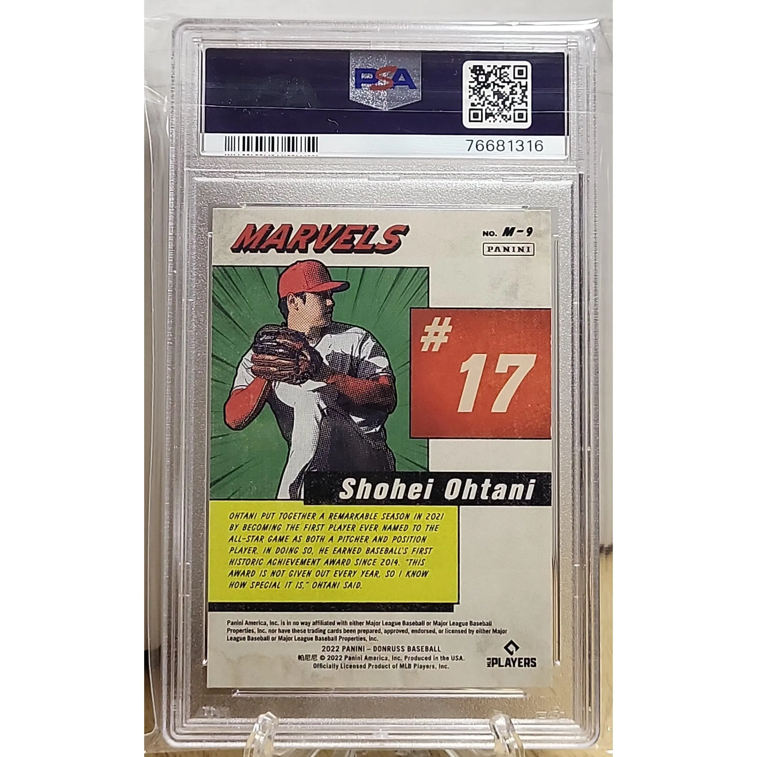 Behold the beauty of the 2022 Donruss #M9 Shohei Ohtani Marvels Rapture PSA GEM Mint 10. This ultra rare collectible is perfect in every way, from the vivid colors to the meticulous detail. Add this masterpiece to your collection today and be amazed!