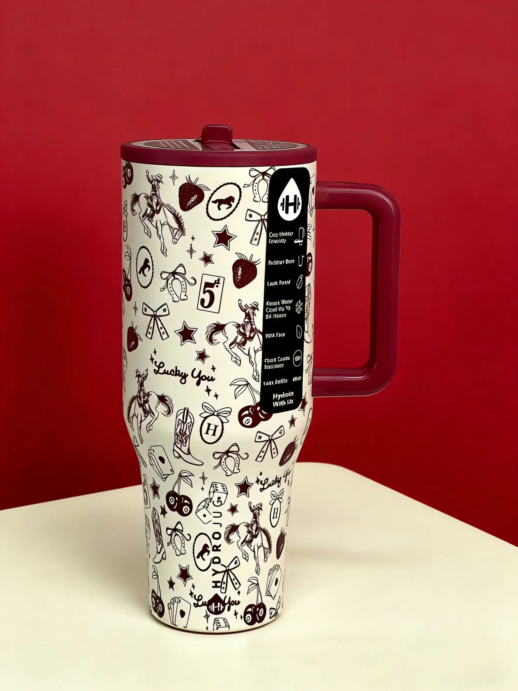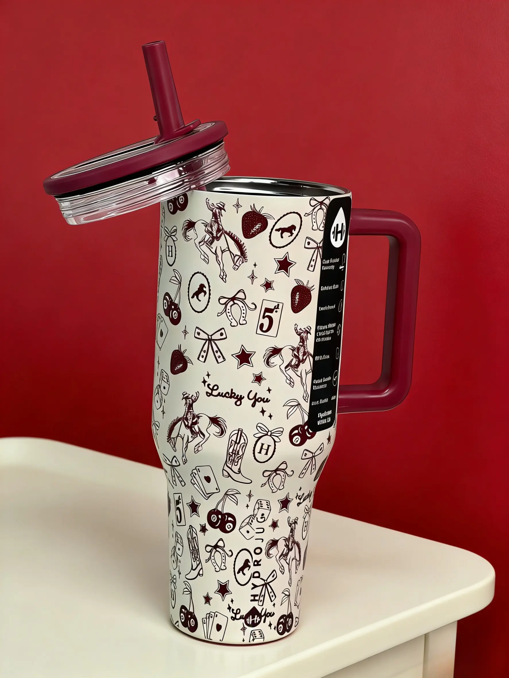 Hydroju Lucky You 40oz Insulated with Handle, Retro Cowboy Print Stainless Steel Travel Cup, Leakproof Lid, Reusable Iced Coffee for Women Men, Ideal for Outdoor & Everyday Use can gym school tumbler Set of Glass Jars Mug and Coaster travel coffee chair