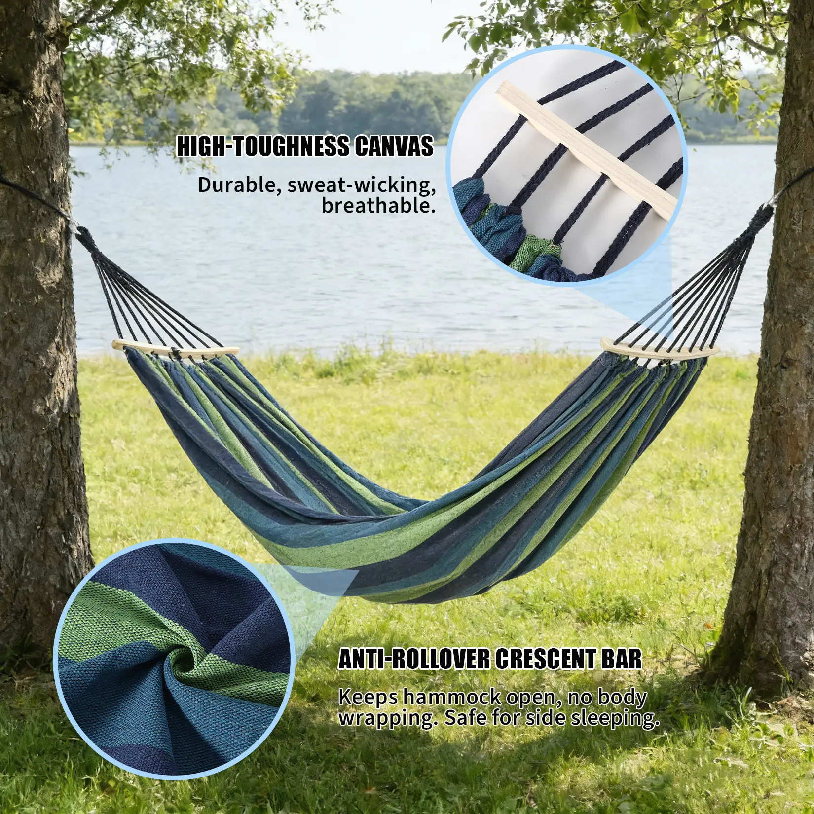 ·- 1-Piece Blue-Green Striped Hammock: Made of high-quality canvas and wood, featuring a stylish blue-green striped design, perfect for adding a touch of to your outdoor or indoor space.
