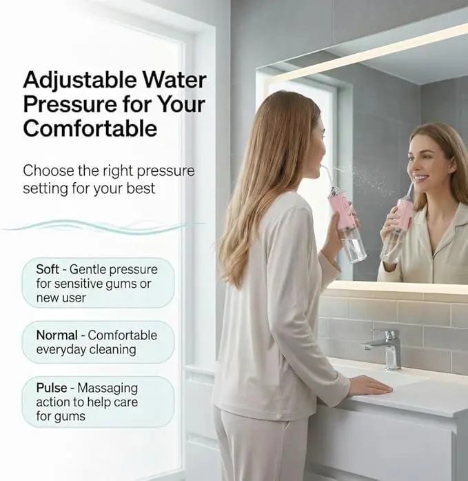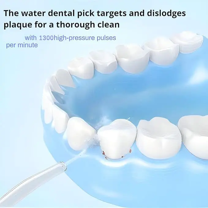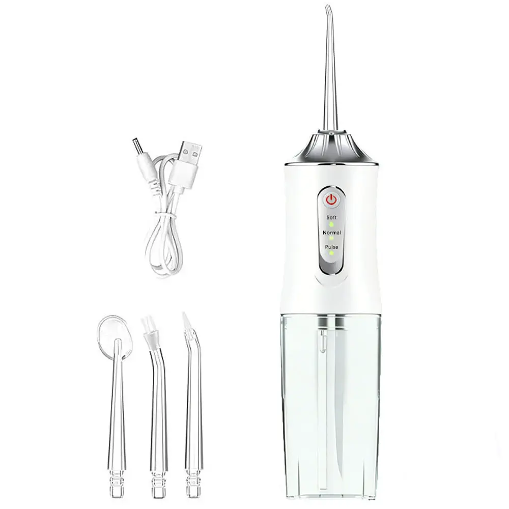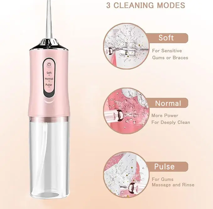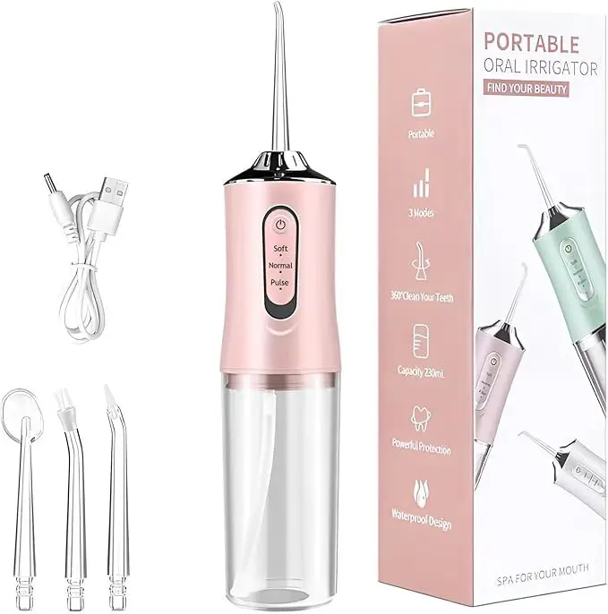 Upgrade your oral care with our Premium Portable Oral Irrigator—your go-to for deep, gentle daily cleaning! Perfect for home and travel, this rechargeable water flosser has 3 professional modes: Soft (for sensitive teeth/beginners), Clean (daily use), and Pulse (deep plaque removal & gum massage). With 1300 times/min high-frequency pulse and 0.6mm ultra-fine water flow, it reaches 40% of toothbrushing blind spots, removing food residues, plaque and bacteria between teeth, under gums and around braces. The 220ML detachable tank, IPX7 waterproof design, and 1200mAh battery (4-hour use) add convenience. 360° rotatable nozzle + 4 jet tips ensure full coverage, while 2-minute auto shut-off prevents dry burn. Lightweight and compact, it’s ideal for on-the-go care. Ditch bad breath, gum inflammation and incomplete cleaning—choose it for a healthier, brighter smile!