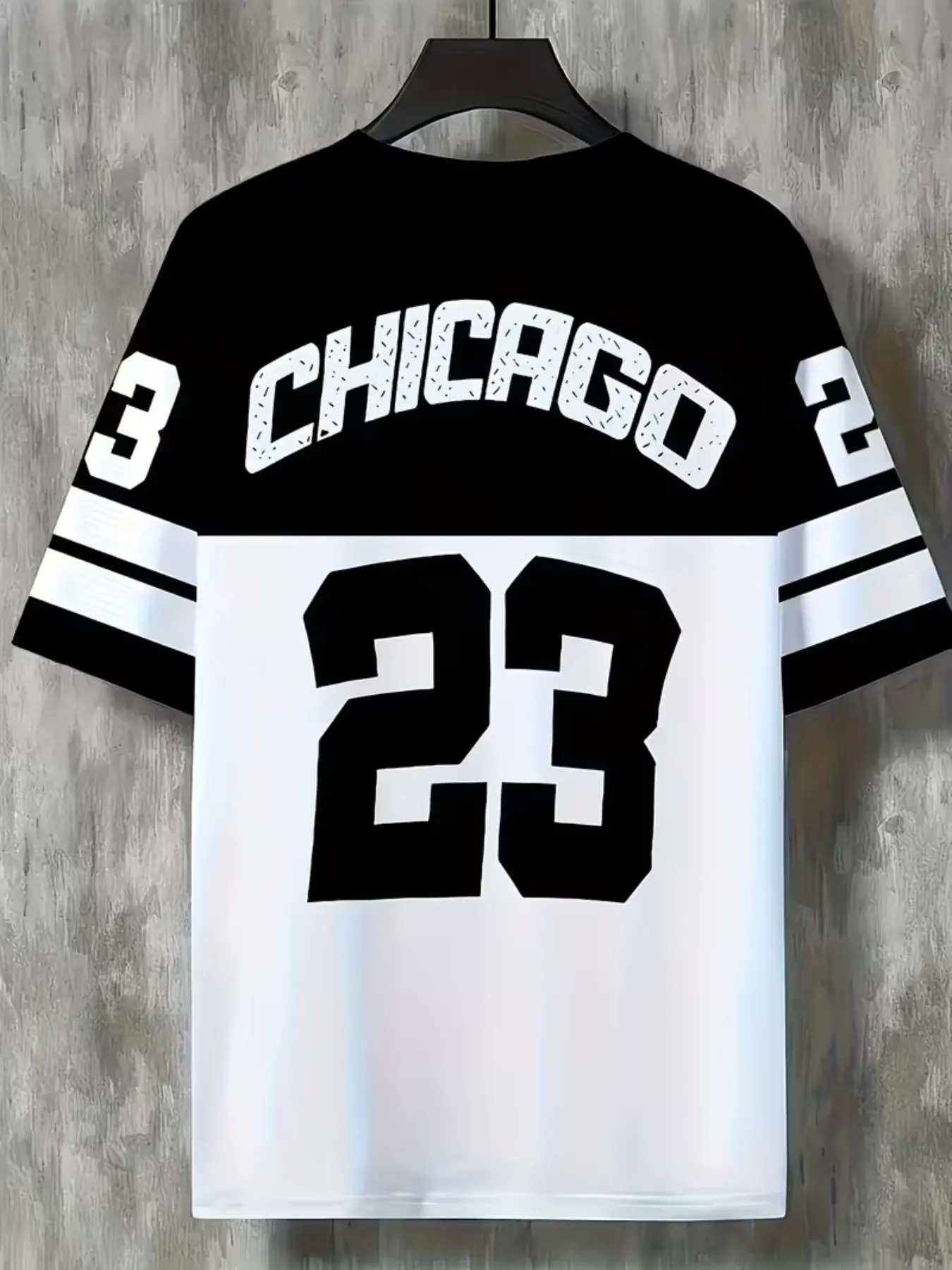 Chicago 23 Print Men's Casual Round Neck T-Shirt, Polyester Knit Fabric, Slight Stretch, Regular Fit, Summer Short Sleeve, Daily and Weekend Wear