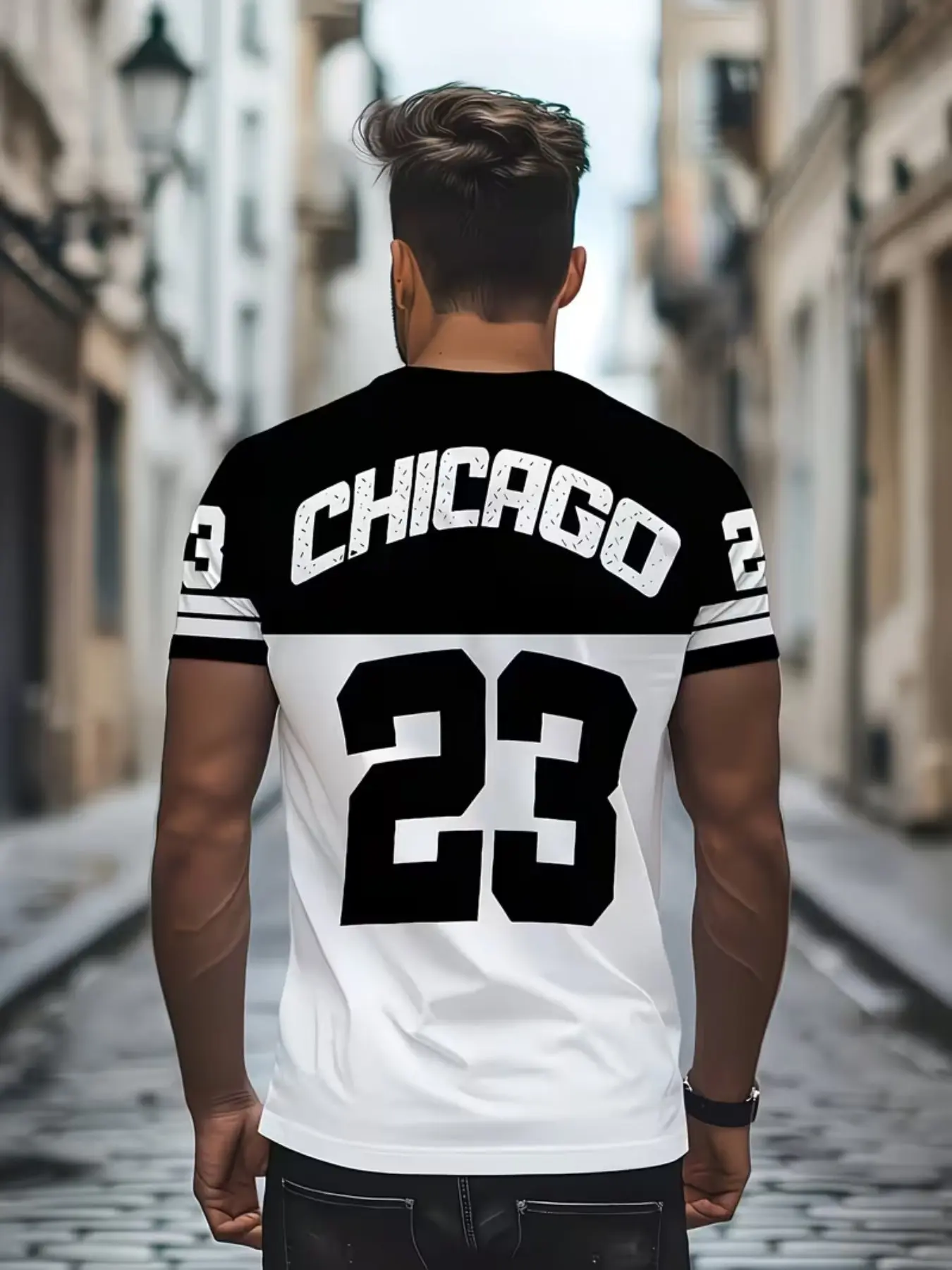 Men's New Casual Round Neck T-Shirt, Chicago Word Design, 32 Number Pattern, Polyester Knit Fabric, Stretchy, Soft Breathable, Outdoor Comfort