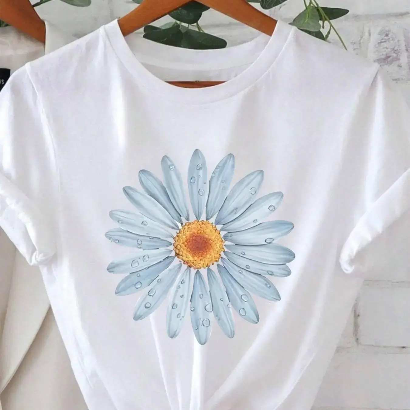 Women'S Casual Daisy Print T-Shirt Short-Sleeved, Round-Neck, Lightweight And Breathable Summer Top, Bright Blue And White Design, Must-Have For Spring And Summer, Floral Print Shirt