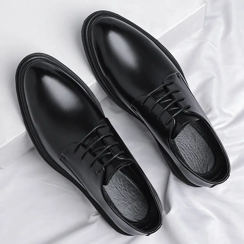 Derby men’s leather shoes with a premium feel—black dress/casual style, height-boosting platform sole, large toe box