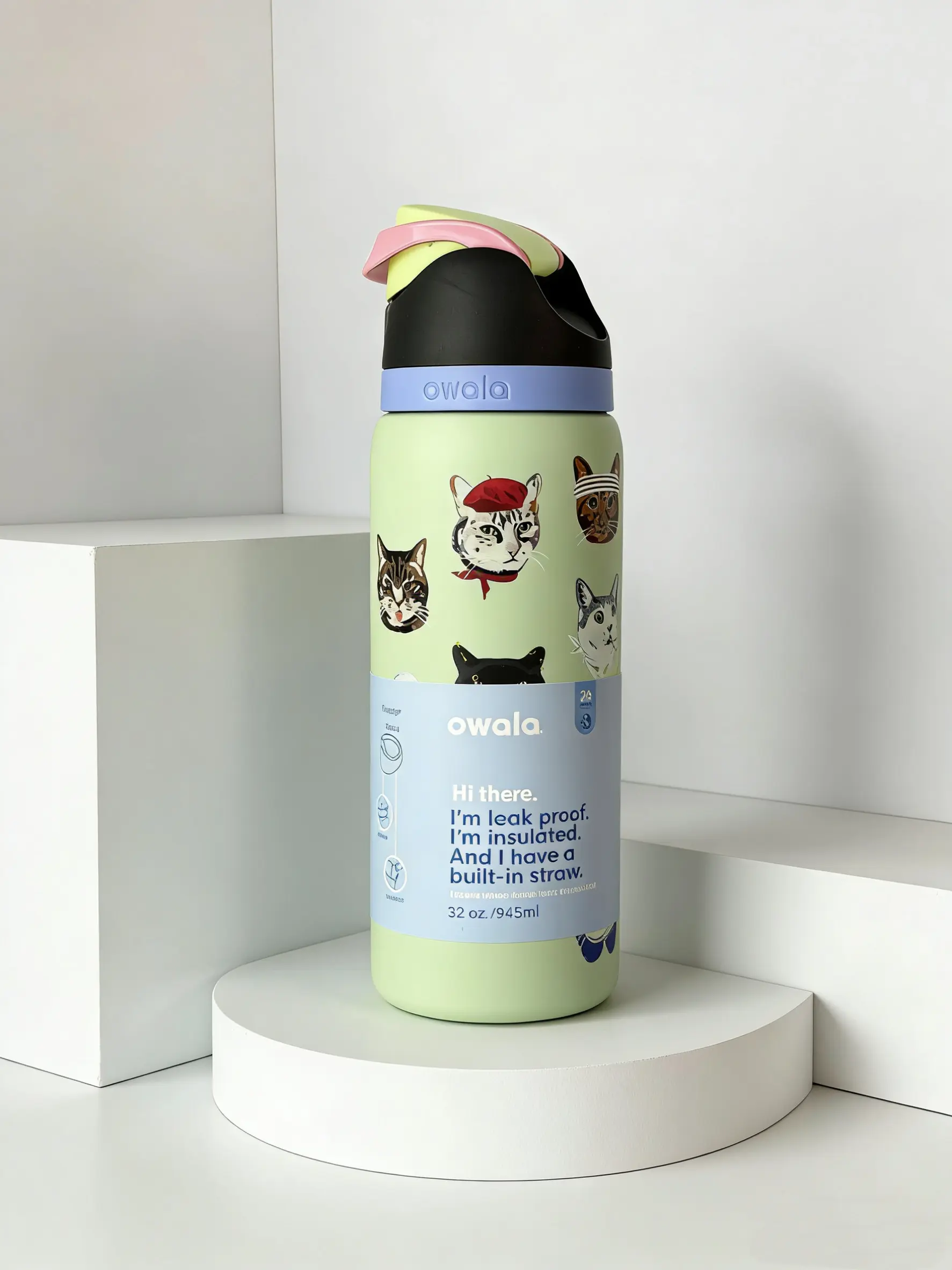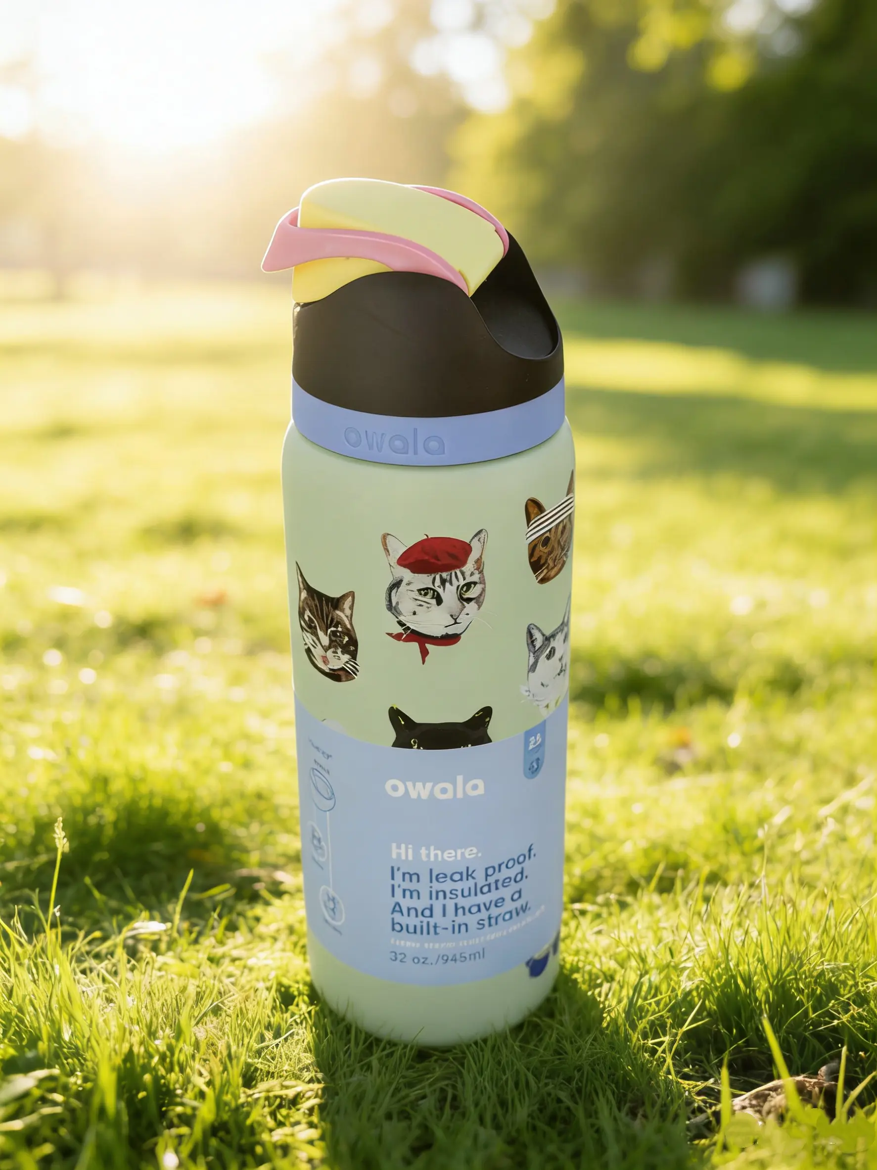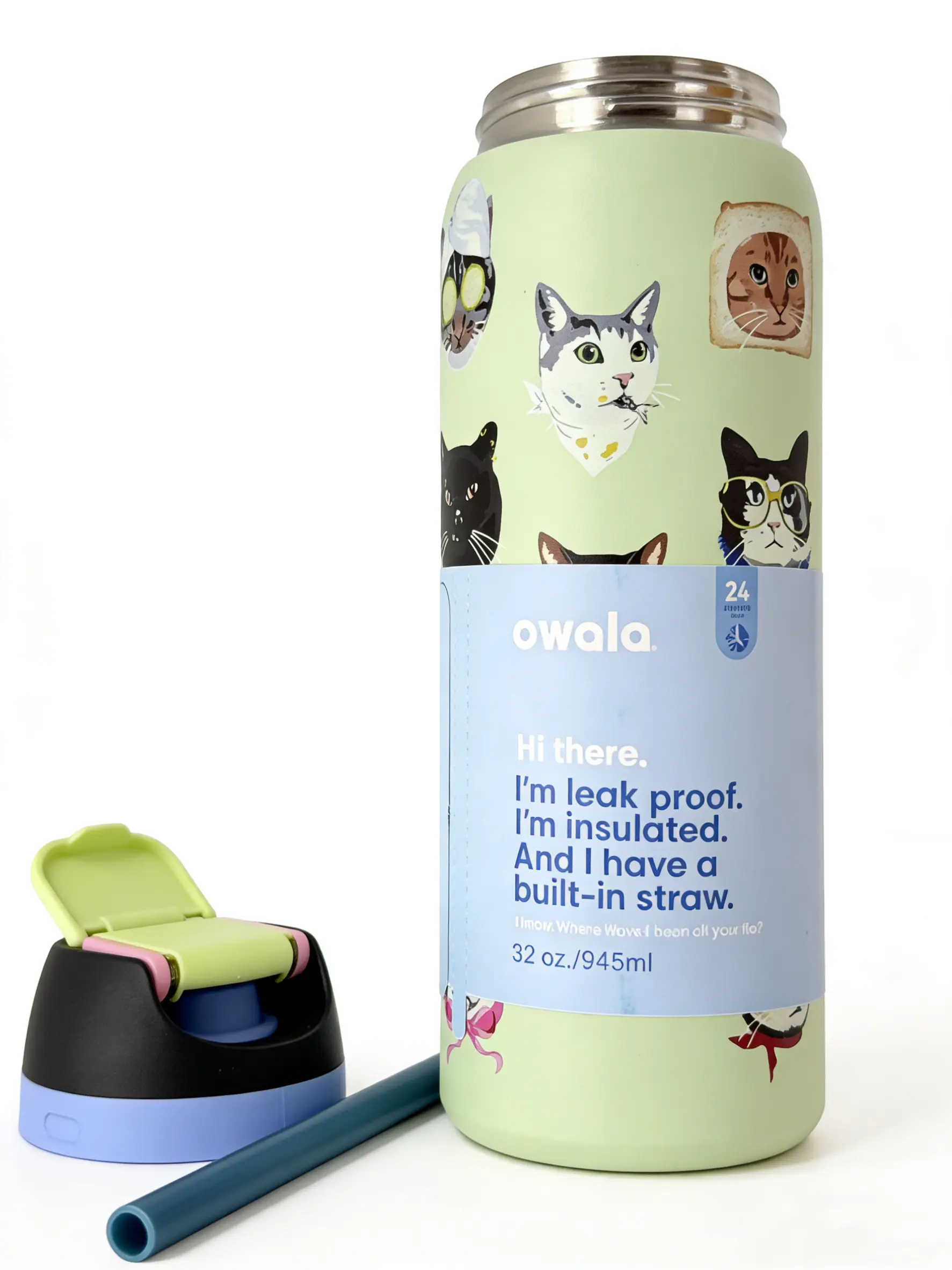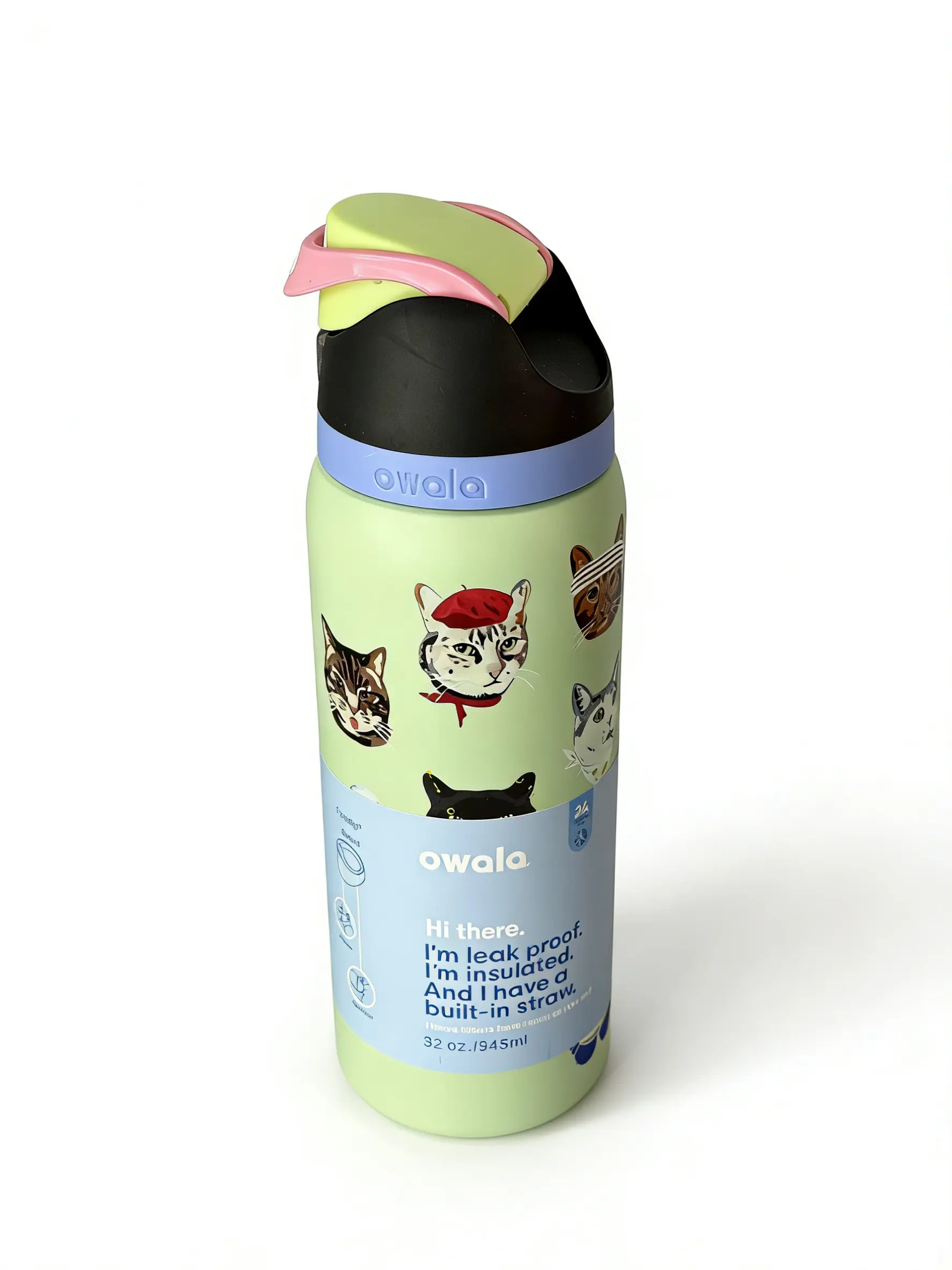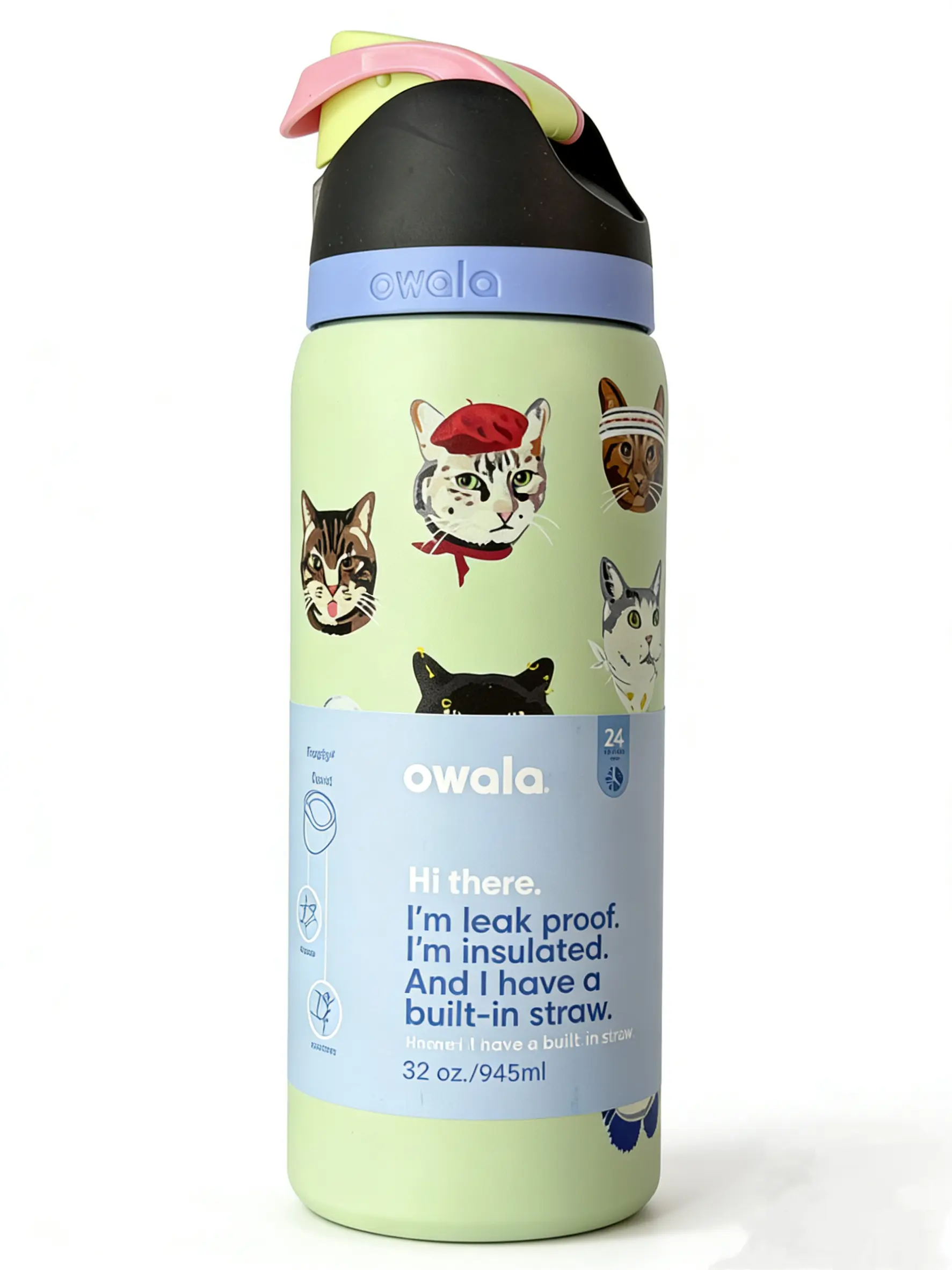 Owala 32oz Fun Cat Lover Stainless Steel Water Bottle with Push Button Straw Lid Insulated for Hot & Cold Drinks Portable Kids Reusable Flask Mug Tumbler