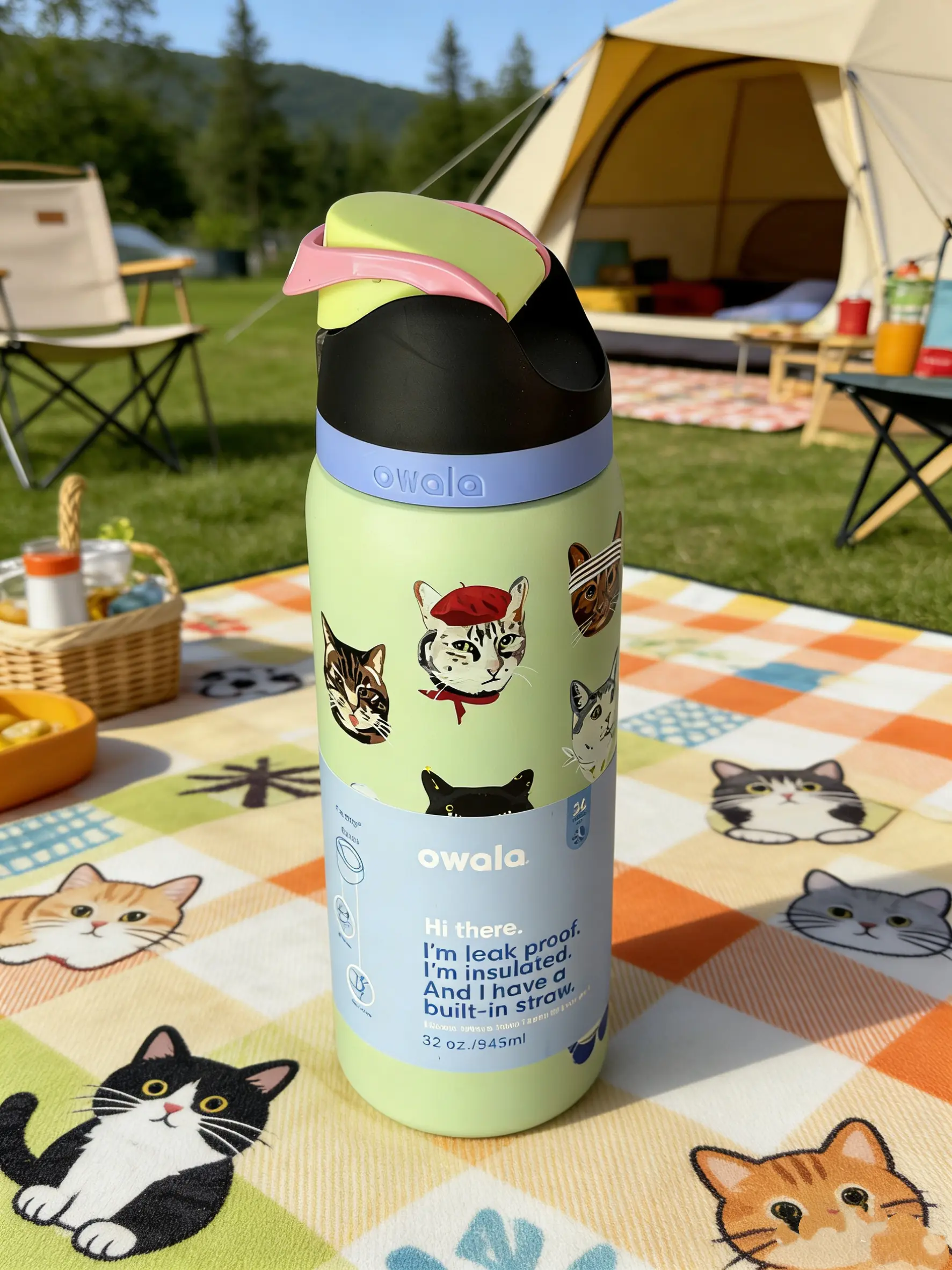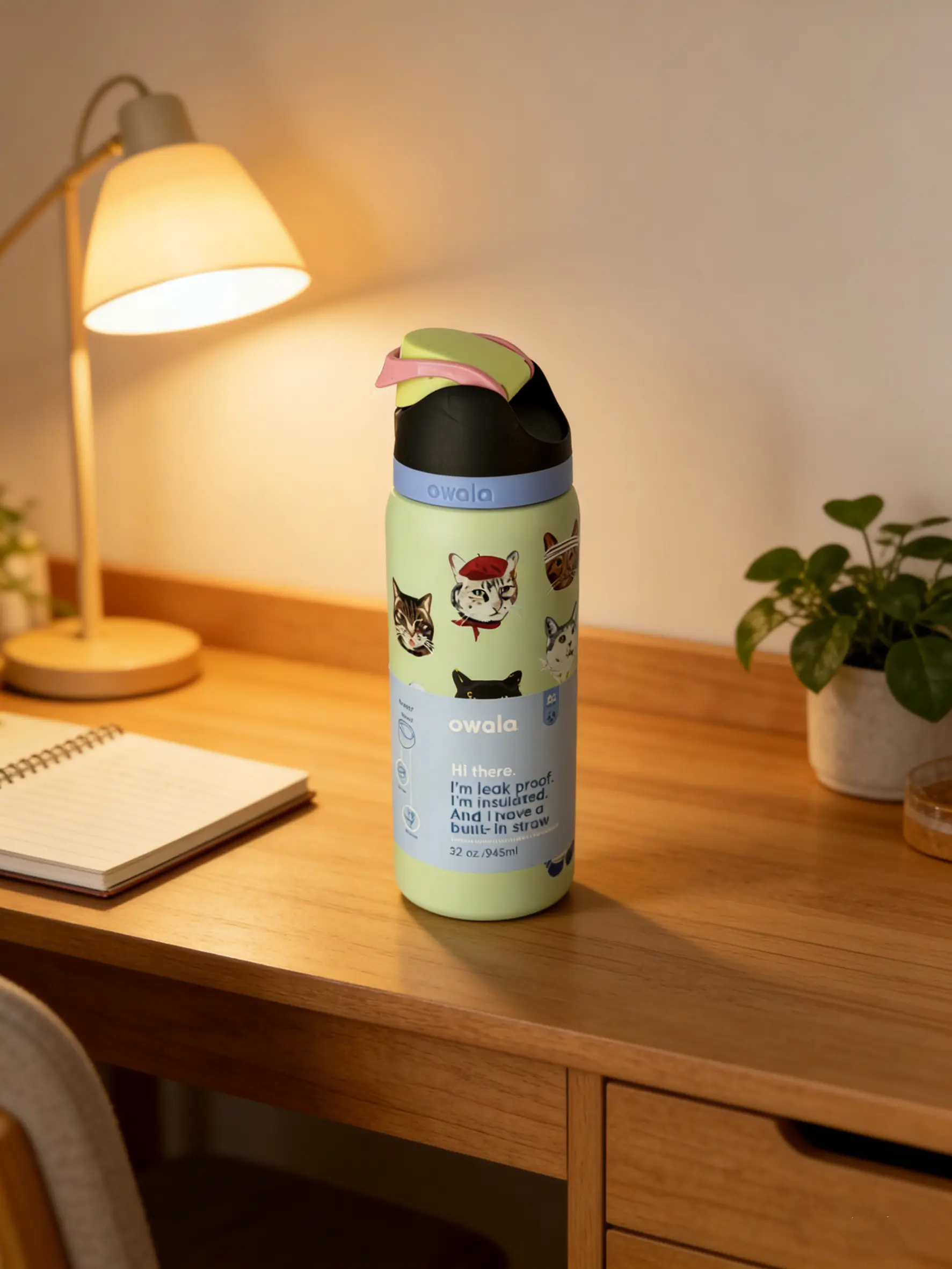 This Owala 32oz water bottle is designed for cat enthusiasts. It features a push button straw lid, making it easy to sip. Ideal for hot and cold drinks, it keeps your beverages at the perfect temperature. Portable and reusable, it's a great choice for kids. Enjoy your drinks in style with this insulated flask mug tumbler.