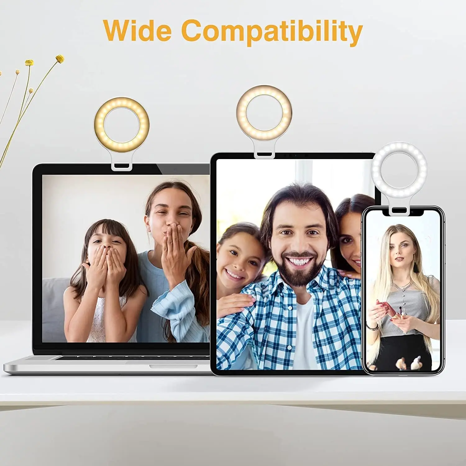 Equipped with 60 LED lights for brighter, more durable illumination. Specially upgraded 600mAh battery provides up to 2.5 hours of use. Comes with a 3ft USB charging cable, so you can use the ring light while charging. The 1.38-inch clip fits most phones, tablets, laptops, and makeup mirrors.