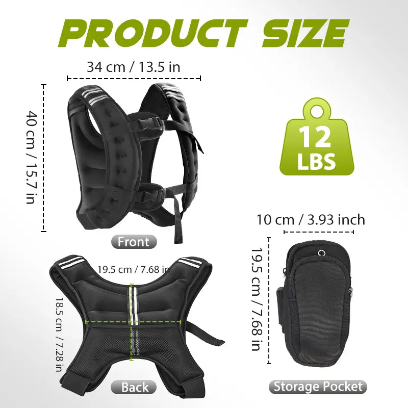 Transform your runs, home workouts, or daily walks with this 12 lb adjustable weighted vest. Perfect for men and women weighing 130–170 lbs. It offers a versatile design for various activities. Common dimensions include a vest length of 40 cm, width of 34 cm, and front panel height of 19.5 cm. The back panel height is 18.5 cm. This vest weighs 12 lbs, providing the right resistance for your fitness goals. 🏃♂️