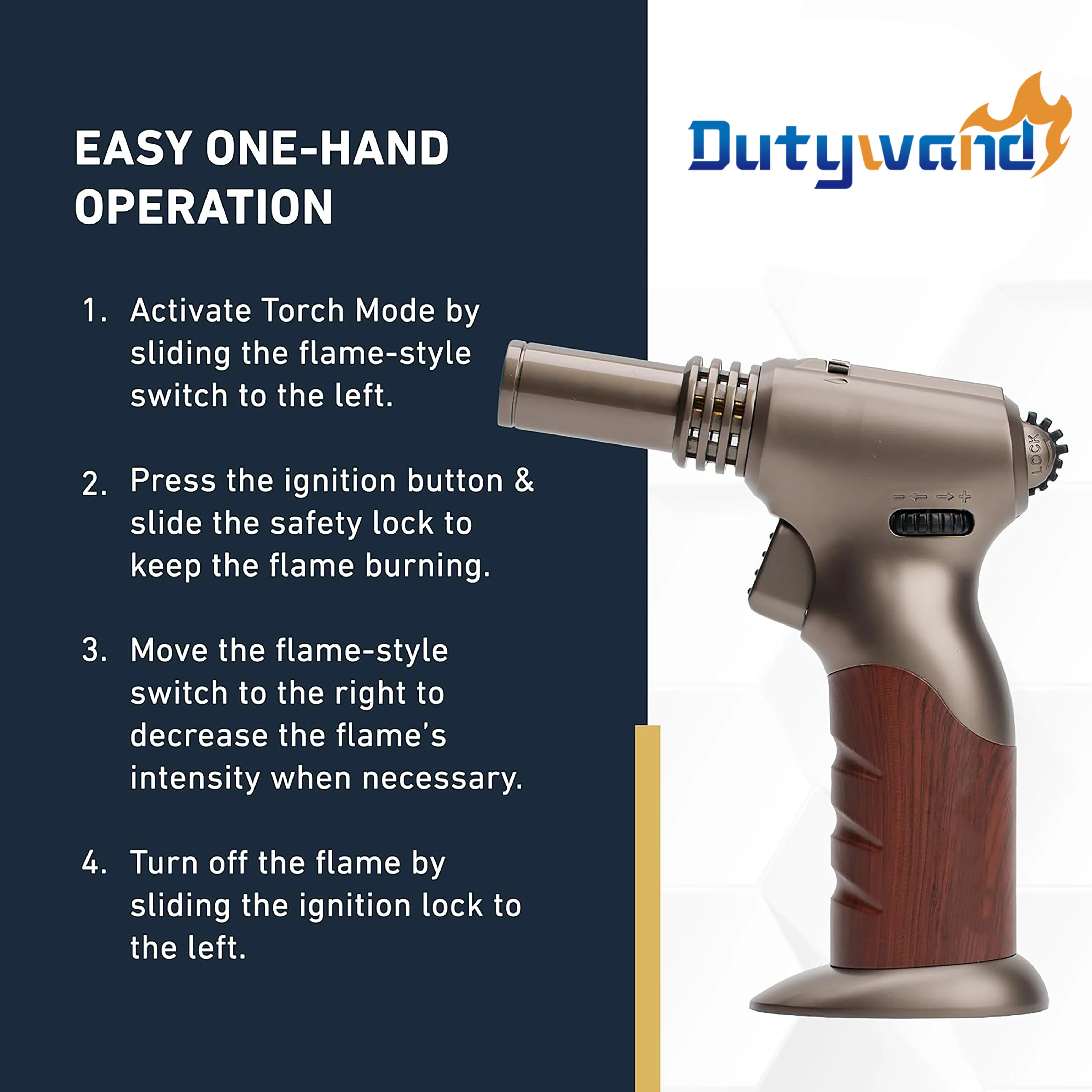 Intense Fire Power: The extreme dual flame lighter styles of the hand torch match your burning passion. Switching from lighting a candle to roasting meat is as easy as sliding the kitchen torch’s switch from left to right. Lock down the ignition button to keep the flame burning.