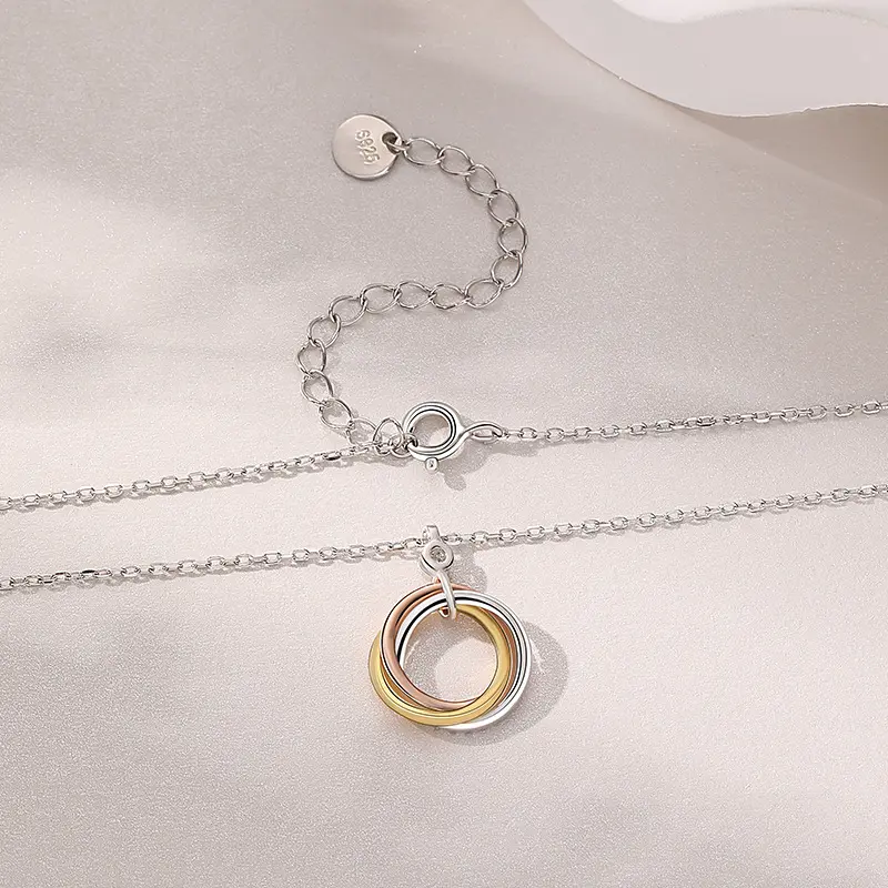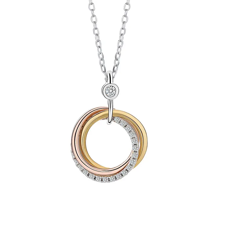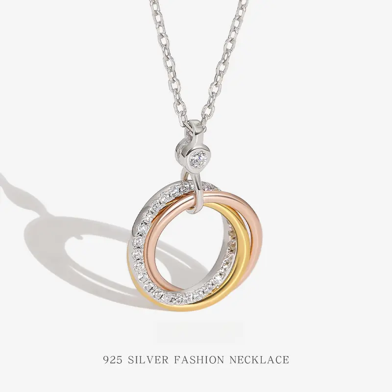 This exquisite necklace features a trio of rings in silver, rose, and yellow tones, adorned with colorful zircon. Perfect for women who appreciate fashion-forward designs. Ideal for daily wear or as a festival gift. The pendant's circle design adds a modern touch to any outfit.
