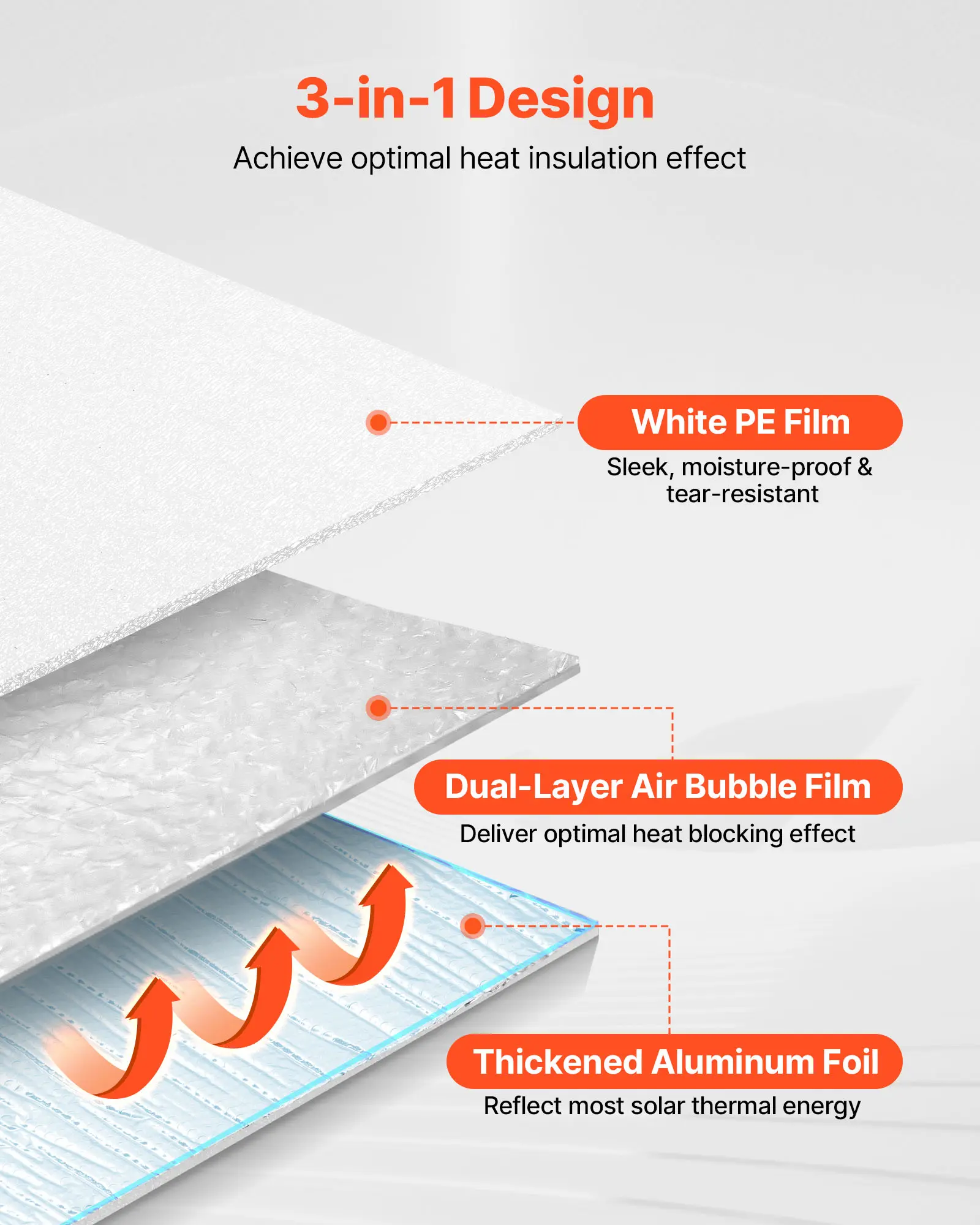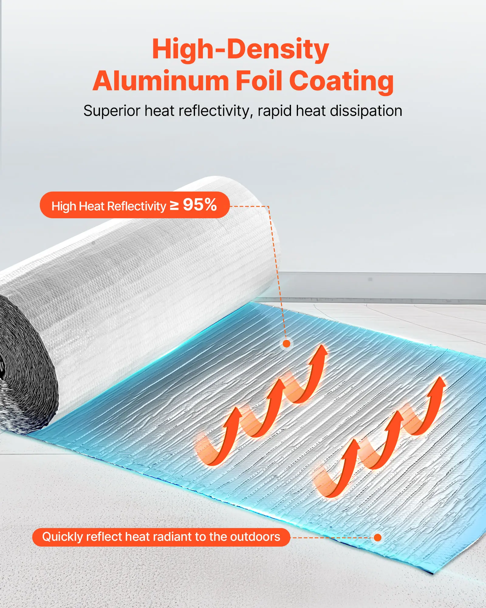 3-in-1 Design: VEVOR 100 ft x 48 in reflective insulation roll features a versatile 3-in-1 design: radiant barrier + insulation + vapour control, ensuring exceptional thermal performance. Excellent radiant barrier keeps you cooler in summer and warmer in winter