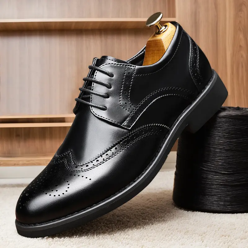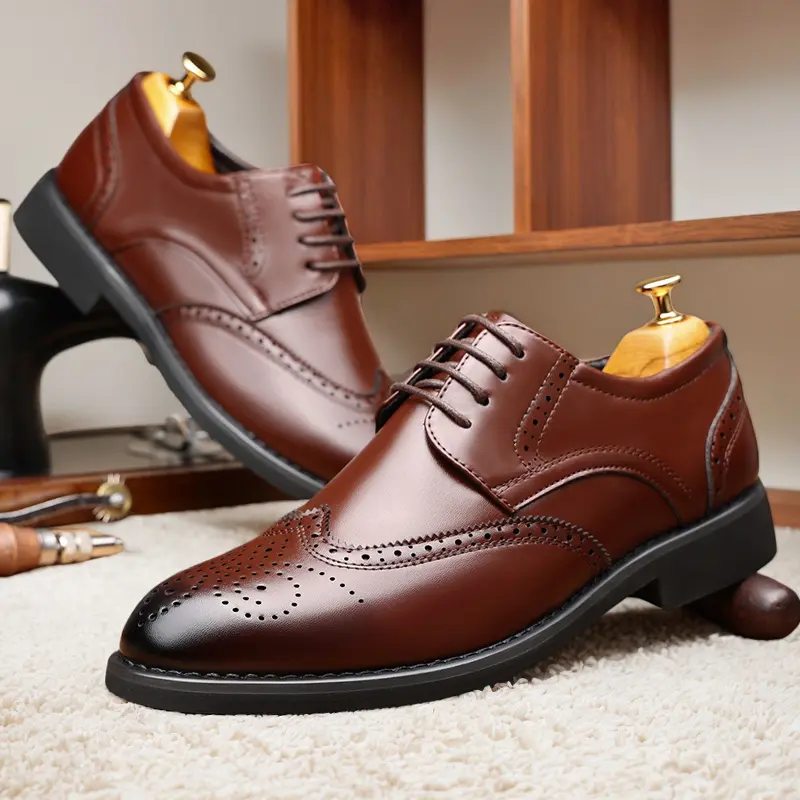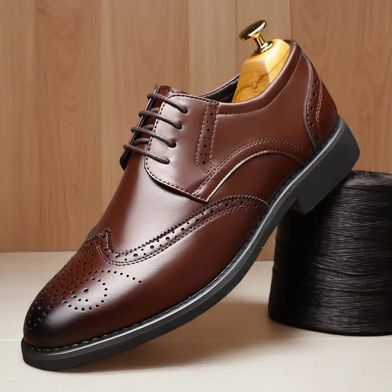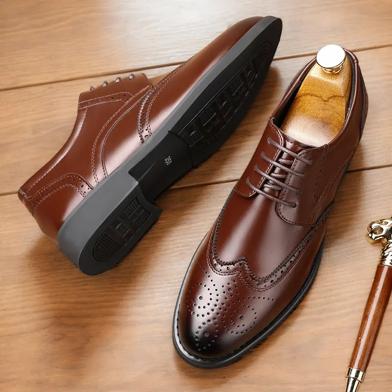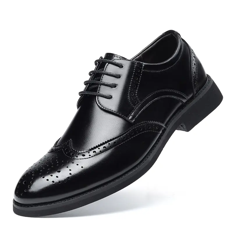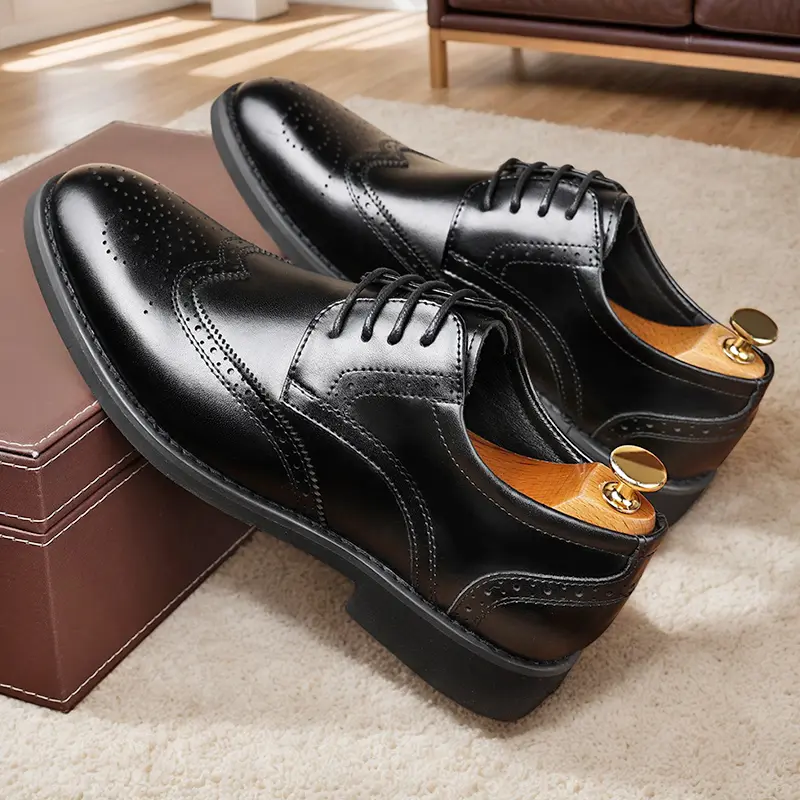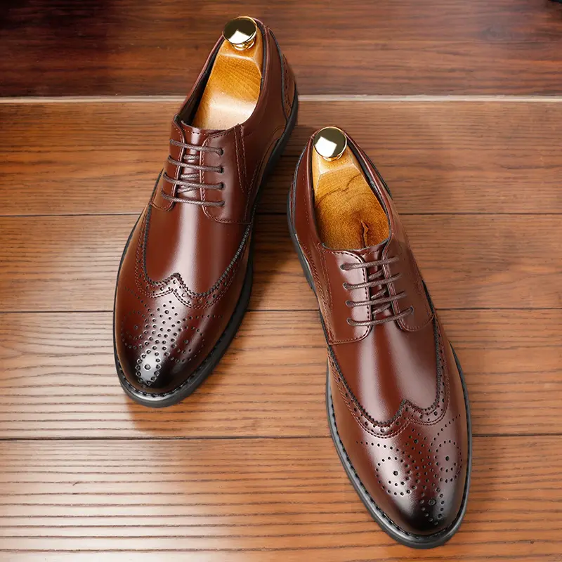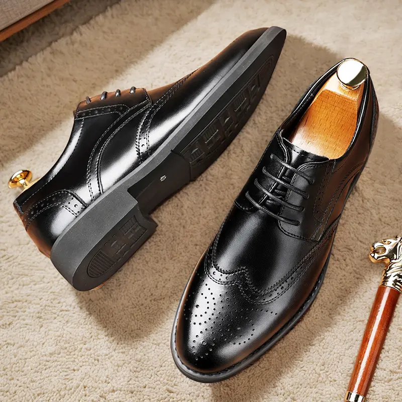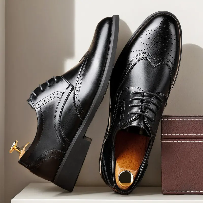 These men's formal oxford shoes feature a classic wingtip design with intricate brogue perforations, handcrafted from high-quality genuine leather. The polished, sleek silhouette delivers a sophisticated, timeless look, perfect for business meetings, weddings, and formal occasions. Available in classic black and rich brown, they suit any formal wardrobe.