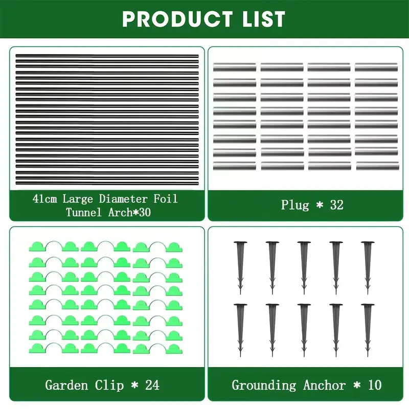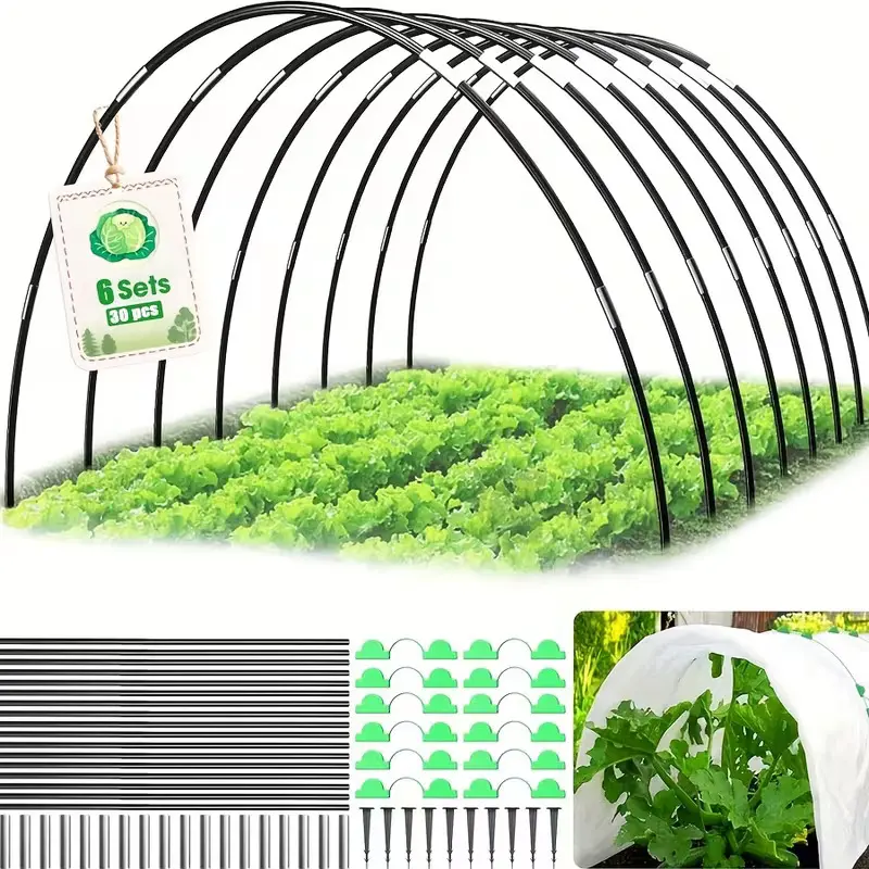 【Garden Hoops for DIY Grow Tunnel】-- 6 Sets Includes 30pcs greenhouse hoops, 10pcs ground stud,30pcs connectors and 18pcs garden clips. With 4 or more garden stakes, you can create various structures like a garden grow tunnel, mini grow tent, small greenhouse, and garden arch. Customize the sizes as needed.