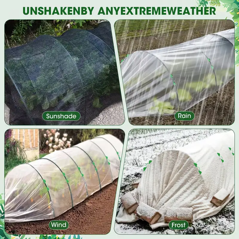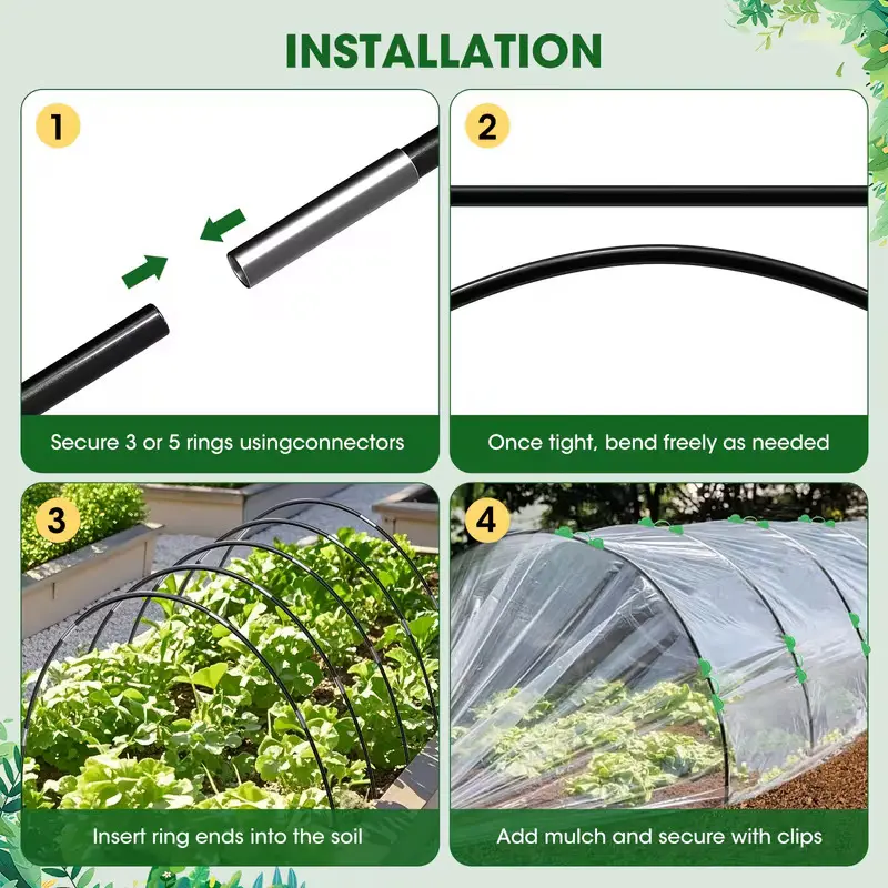 【Effortless Assembly】-- Assembly is a breeze! Simply insert the hoops into the soil, connect them using the provided connectors, and easily bend them to fit your needs. Secure the row cover with the convenient garden clips to ensure optimal plant protection.