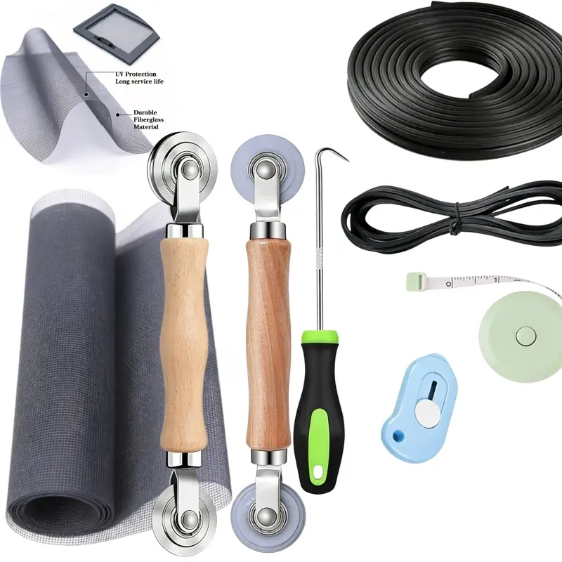 【Perfect screen tool kit】(1)40ft spline for the window screen has high tensile strength; The hollow design is easy to press into the groove but can also supply enough pressure to fix the screen. (2)The screen roller tool material is a solid beechwood handle + double steel bearing metal wheels; the rim is smooth and doesn't scratch the screen. (3)The spline hook makes it easy to move the old spline. (4)A utility knife and measuring tape make it easier and faster to replace the screen windows.