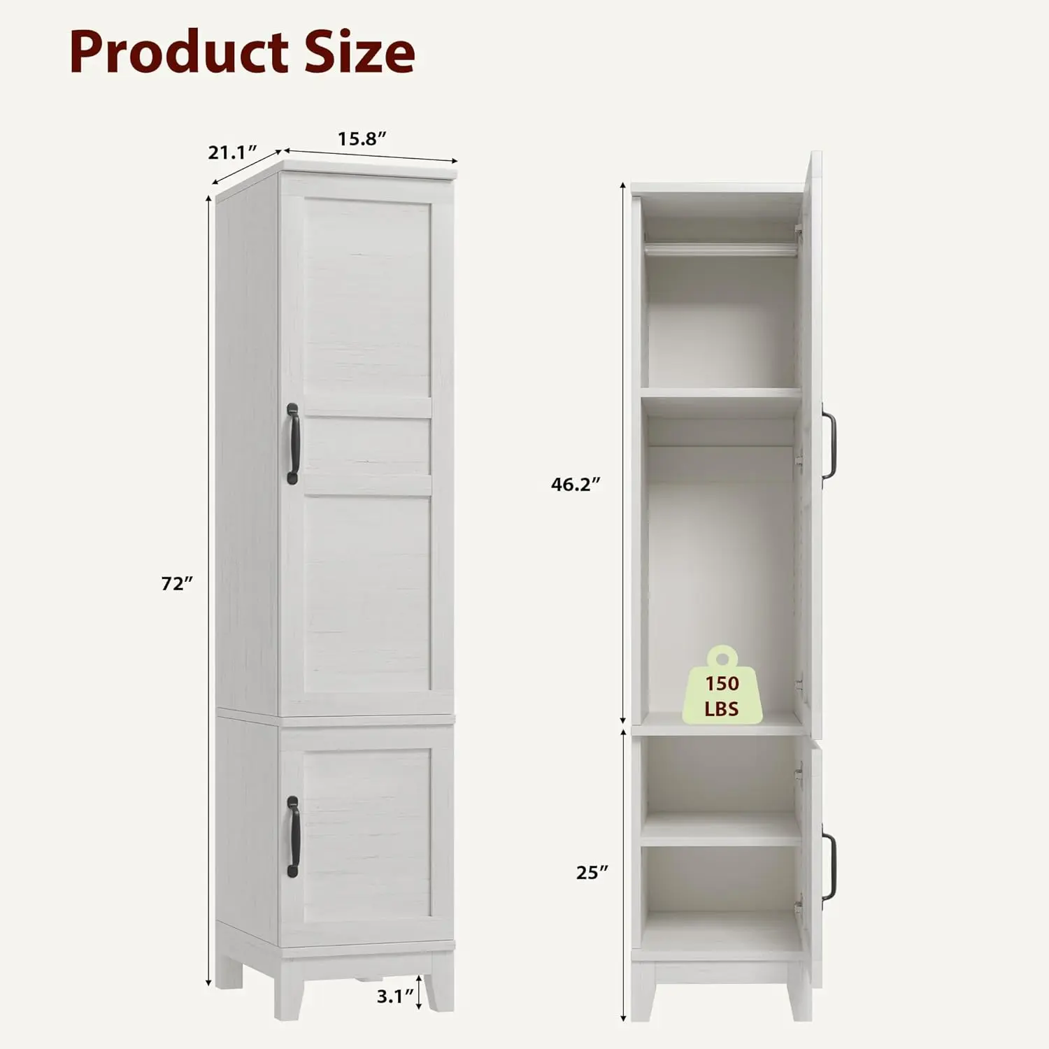 ·Ample Storage Space: The large armoire wardrobe features 2 doors and 2 large storage spaces to accommodate folded clothing, bags, socks, toys, and toiletries. Featuring a high-grade aluminum hanging rod, silent-closing damping hinges, and a fortified back panel. The 21.11 in D deepened wardrobe provides more storage space. Dimensions: 15.79 in W x 21.11 in D x 72.01 in H.