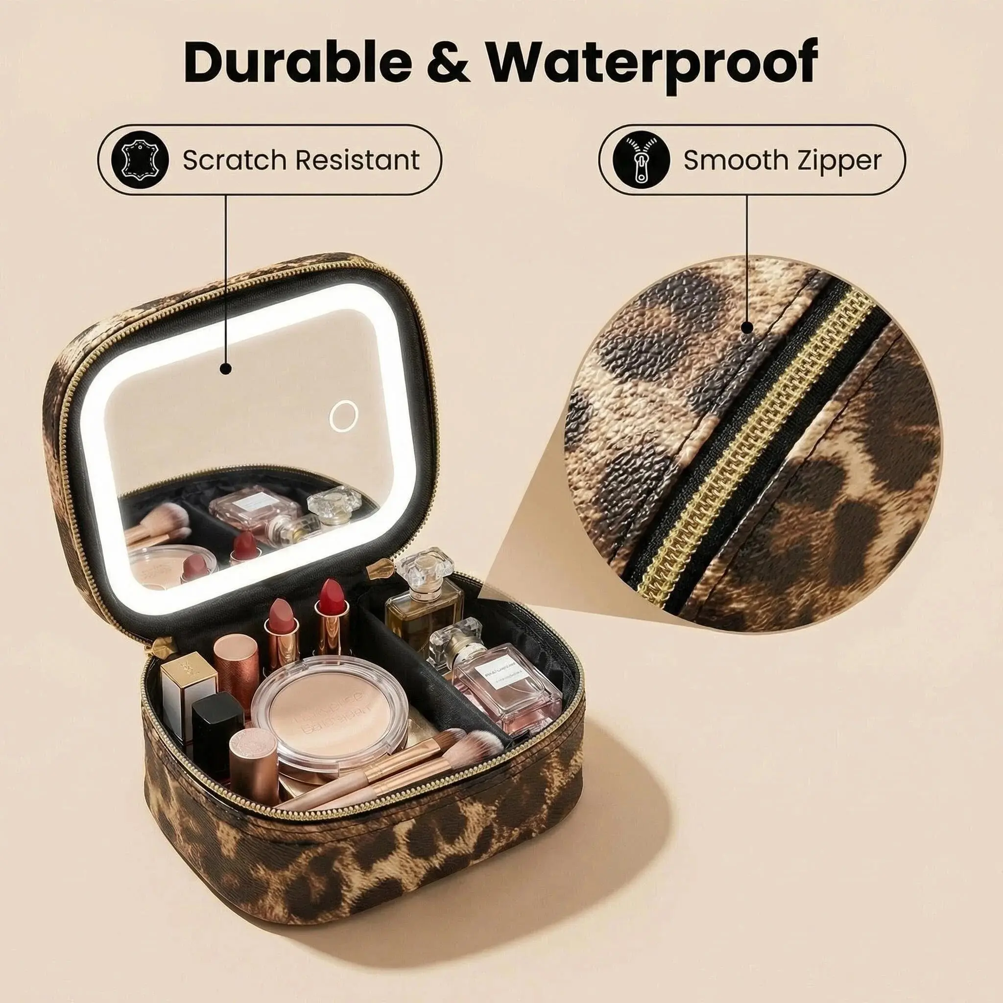 Spacious interior fits makeup brushes, foundation, lipstick, skincare products, and beauty tools.