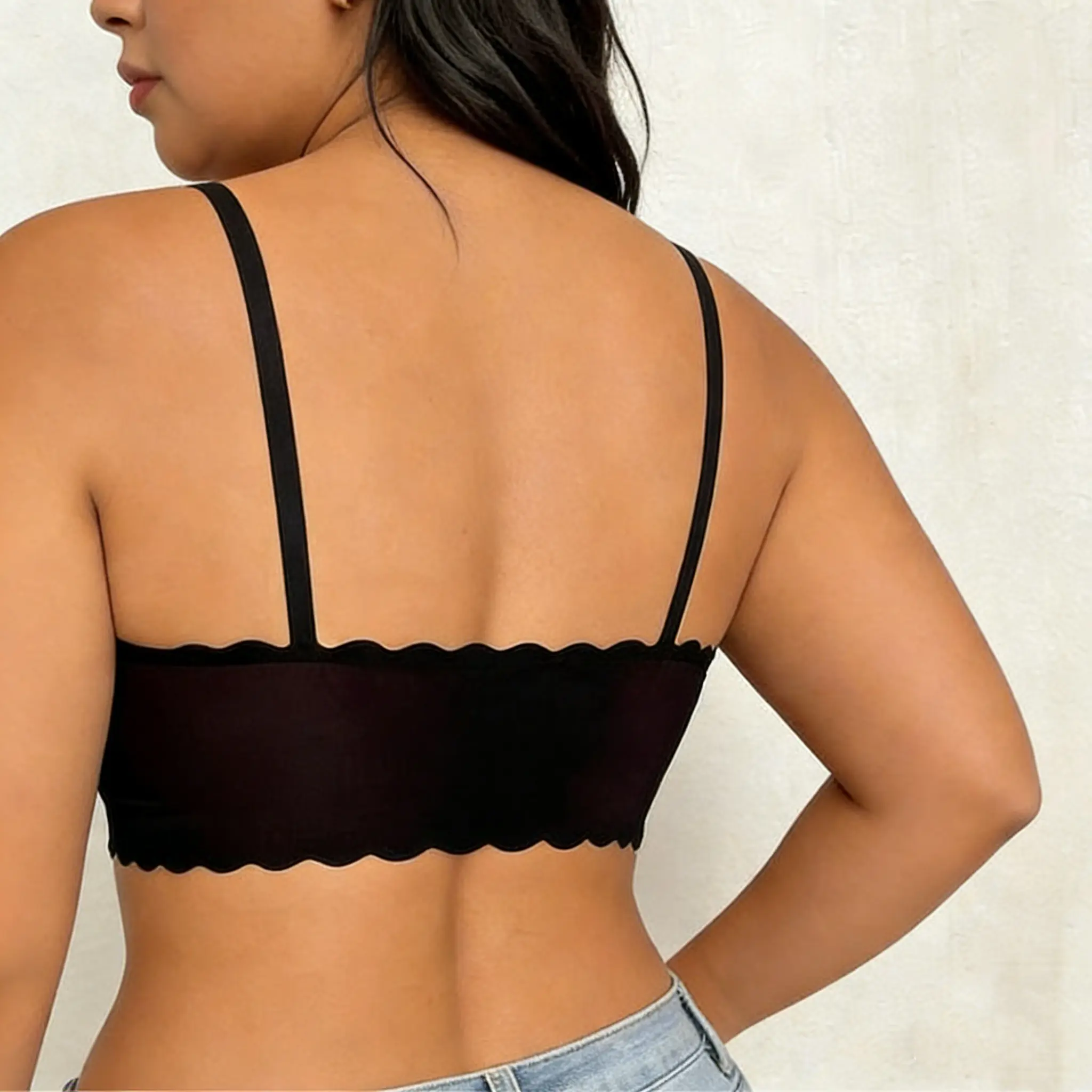 This women's sports bra camisole offers a sleek, one-piece design. It features a smooth surface, enhancing a sexy and push-up look. The bra supports side breasts, perfect for young women. Available in black, dark skin tone, and champagne, it suits all seasons. No steel support is included. Fixed double shoulder straps ensure comfort.