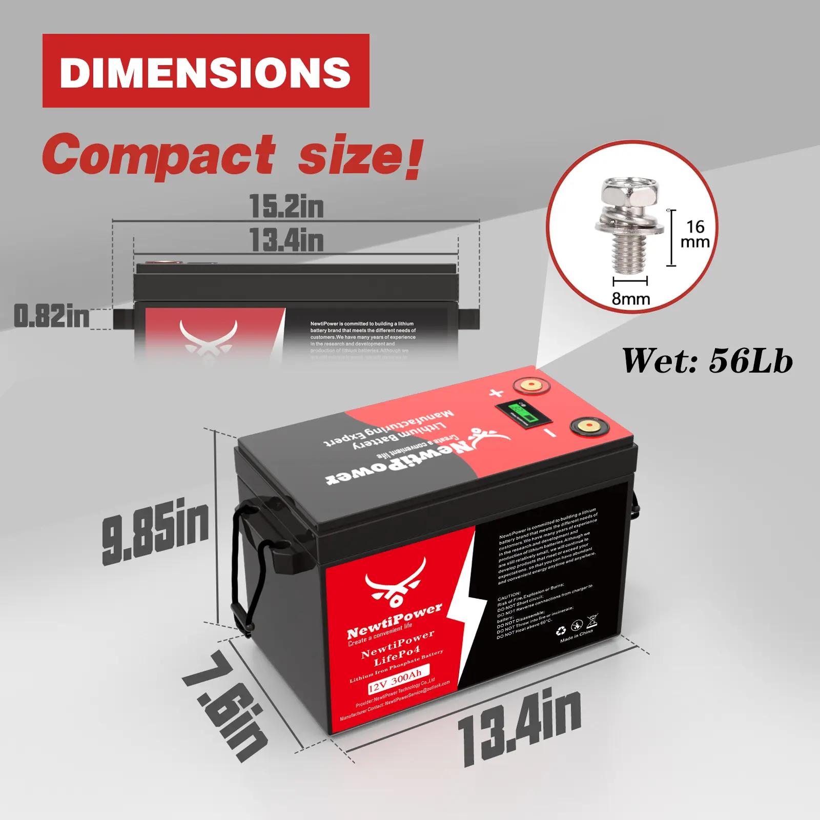 【High Energy Density &100% Real Capacity】NewtiPower 12V 300Ah lithium iron phosphate battery weighs only 56 lb, half the weight of lead-acid battery and twice the capacity of lead-acid battery. It is easy to move and install. The available capacity of our LiFePO4 battery is 100%, compared with other brands of batteries, which only provide 60% ~ 80% of the capacity. We are not afraid that you test with a capacity test instrument after receiving the battery. We have great confidence in our products!