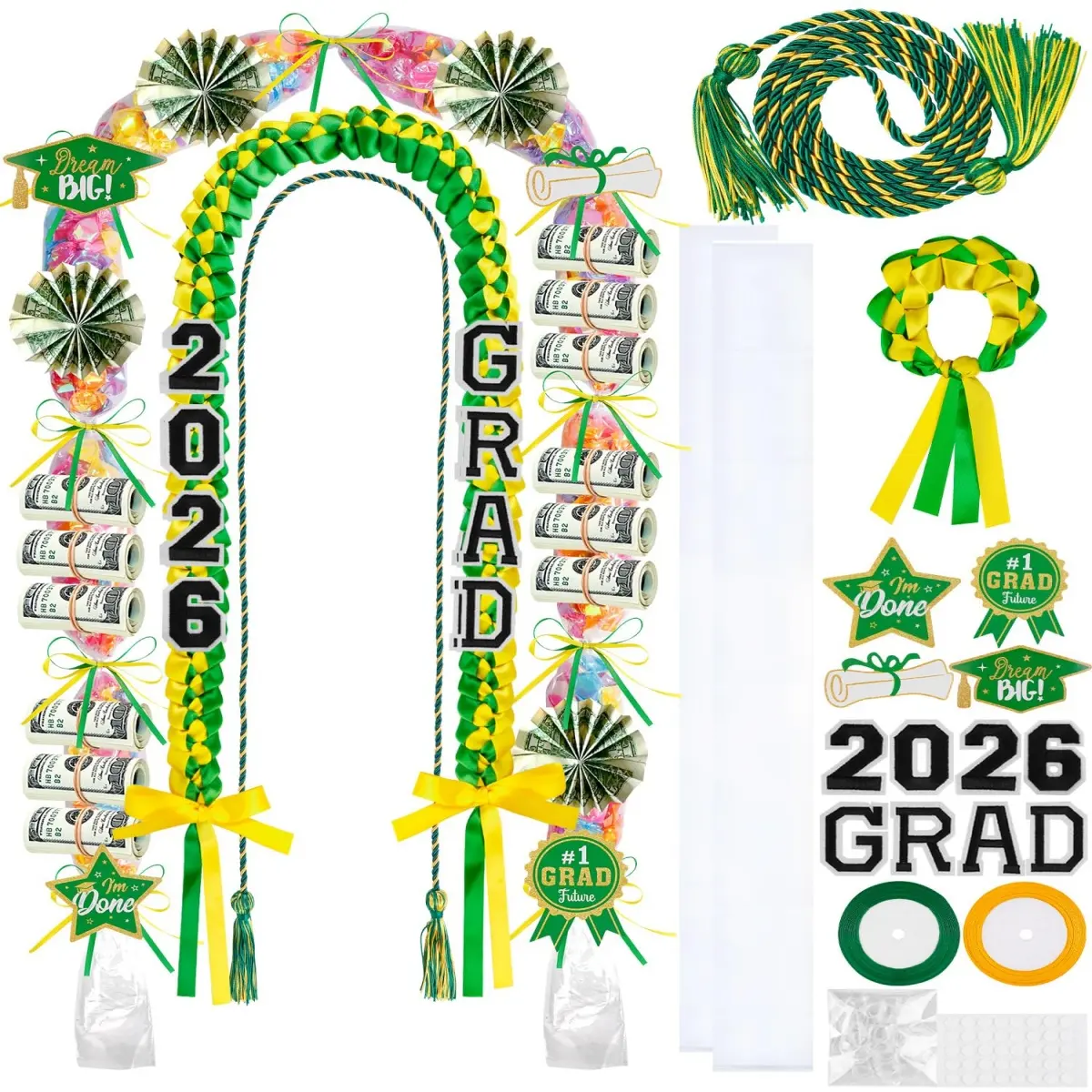 ONERIR 2026 Graduation Leis 18 Pcs - Vibrant Yellow Green Double Ribbon Youthful Class of 2026 Graduation Candy Lei Set Unisex Graduation Party Decorations Gift