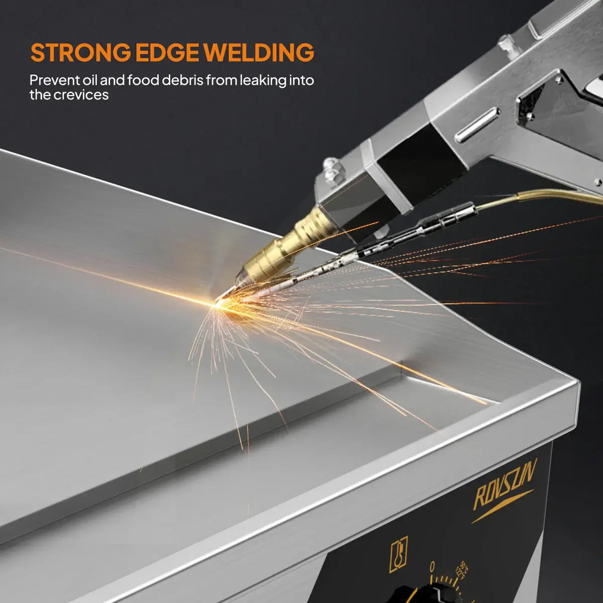 4. Effortless Cleaning Maintenance: Designed with busy kitchens in mind, our flat top grill features a non-stick cooking surface and removable grease catch pan for quick and easy cleanup. The smooth seasoned cooking surface prevents food from sticking. Simply wipe down after cooking, and you're ready for your next culinary creation. The corrosion-resistant stainless steel construction ensures long-lasting durability and easy maintenance.