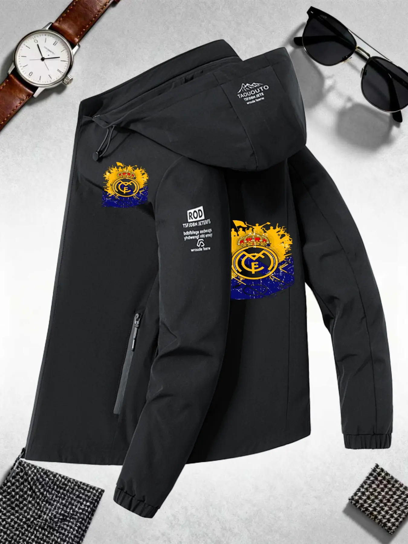 Unisex Minimalist Luxury Functional Jacket, Crown Basketball Print, Lightweight Motorcycle Riding Coat, Zipper Hooded Outerwear