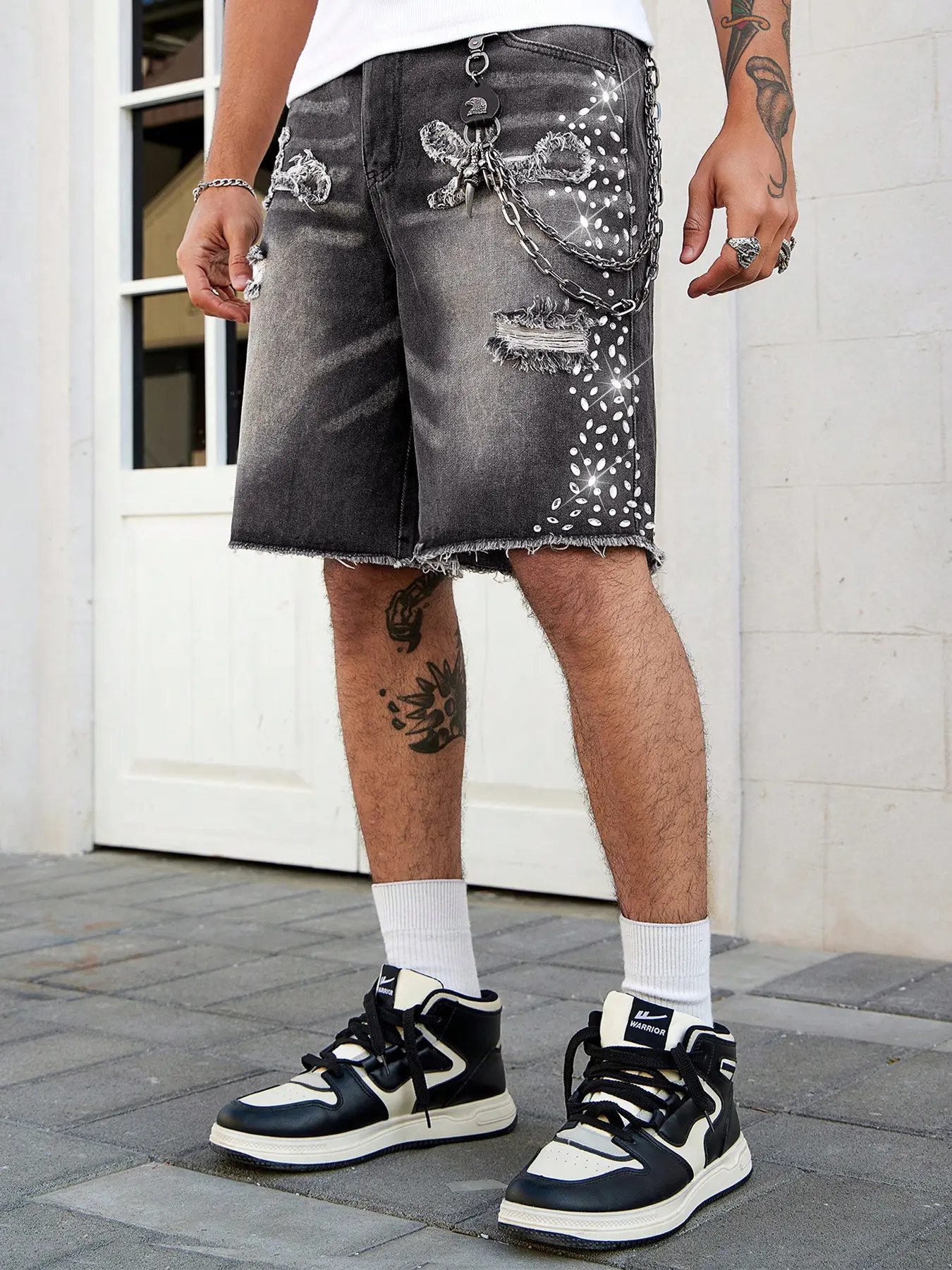 mens jorts,Rhinestone-Embellished Denim Shorts, Low-Rise Frayed Denim Shorts, Loose-Fit Jeans, Distressed Slim-Fit Straight-Leg Jeans