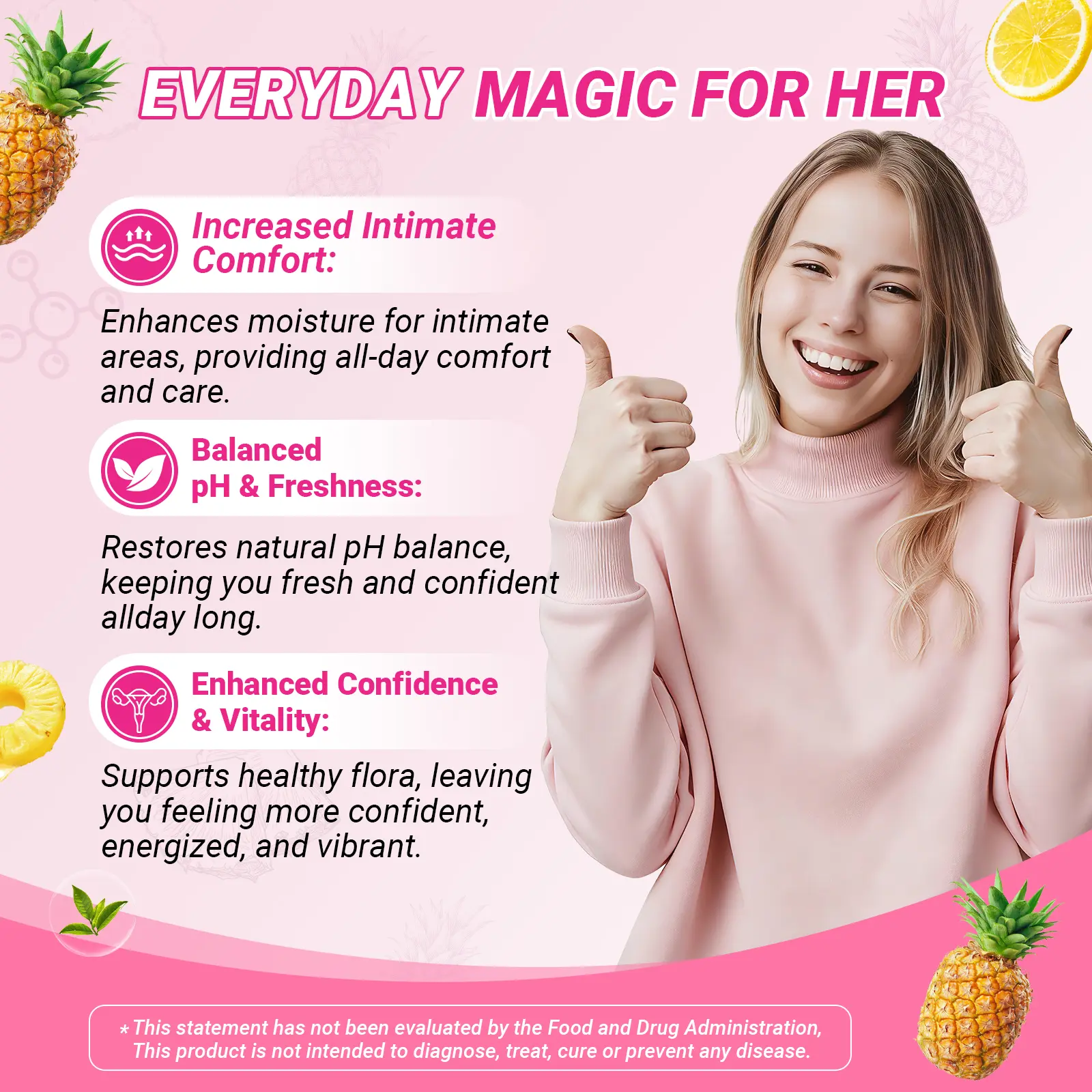 These gummies are a dietary supplement designed specifically for women. They combine probiotics and slippery elm for comprehensive health support. Ideal for daily use. 🍍