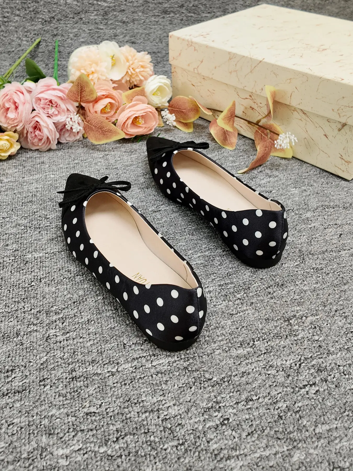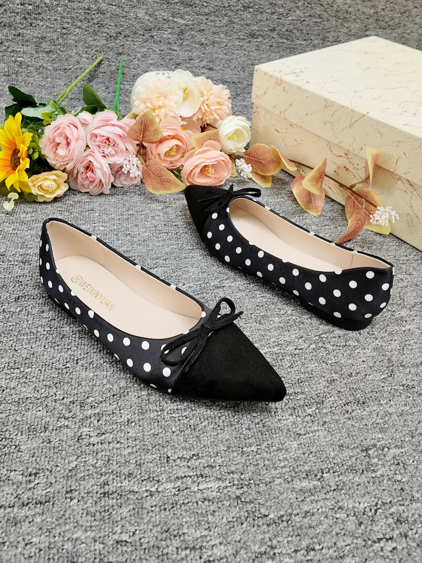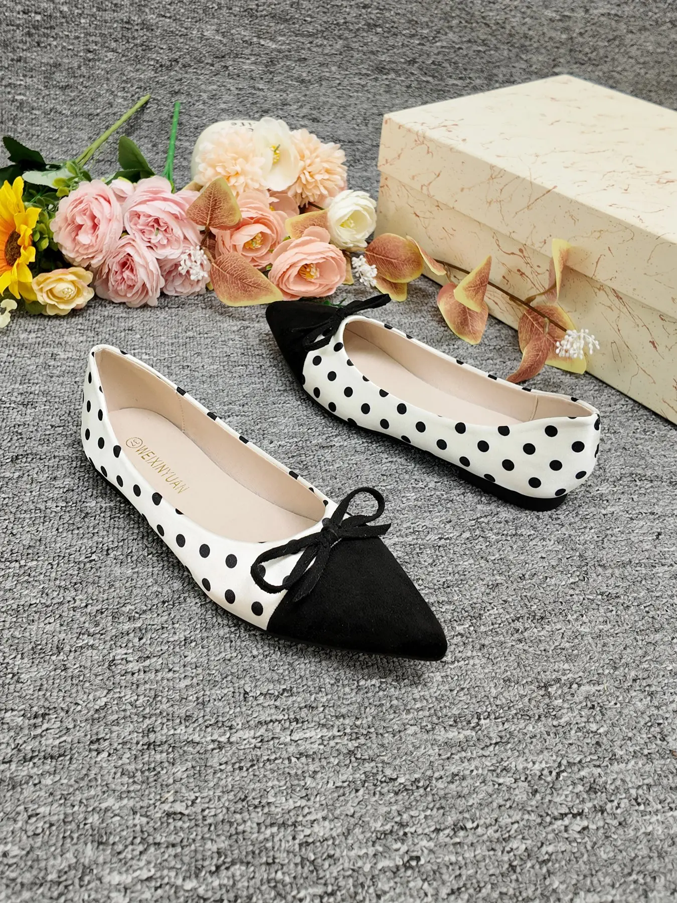 Elegant Polka Dot Colorblock Pointed Toe Shoes, Bow Soft Sole Low Heel Flats, Professional Office Women's Shoes