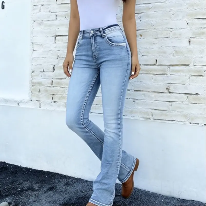 Design:classic 5-pocket design with zipper and button closure,wide flared hem and raw hem create different fashion sense,soft and elastic denim fabric,comfortable to wear