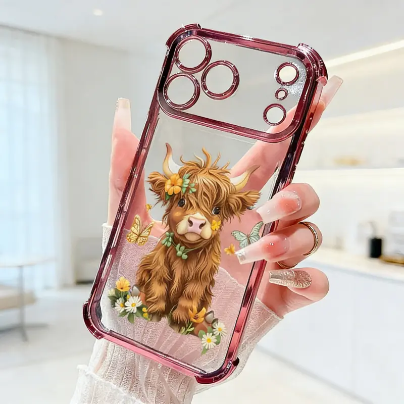 Protective Four Corners Plated iPhone Case for iPhone 17 16 Pro Max 15 Plus 14 13 12 11 Air Flower - adorned Highland calf Patterned Shockproof Transparent Soft Silicone Cover