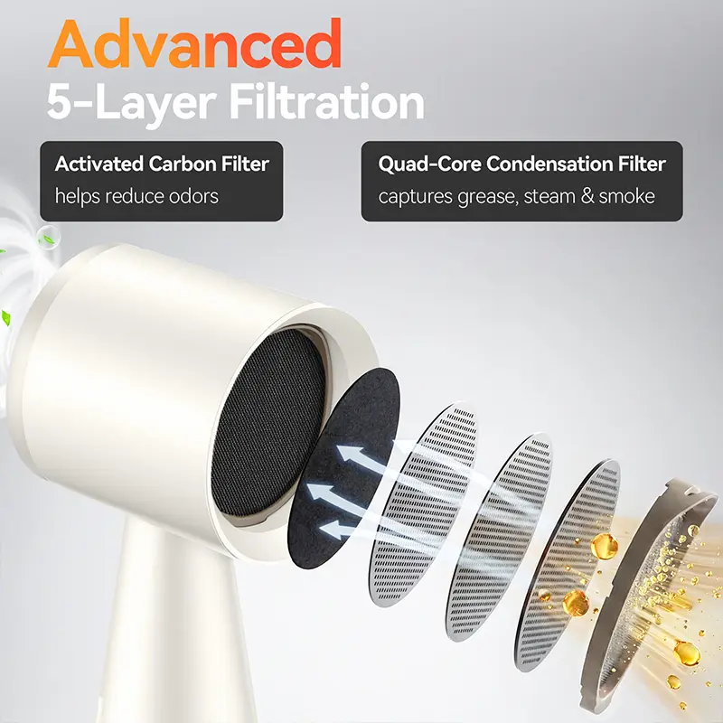 ·Say Goodbye to Lingering Smoke & Odors: Equipped with a 3-stage filtration system (Polymer filter screen + aluminum alloy condenser screen + activated carbon filters), this portable range hood traps grease particles and neutralizes stubborn cooking smells at the source. Whether you're searing steak in a studio apartment or hot potting in a dorm room, enjoy a smoke-free, fresh-air cooking experience