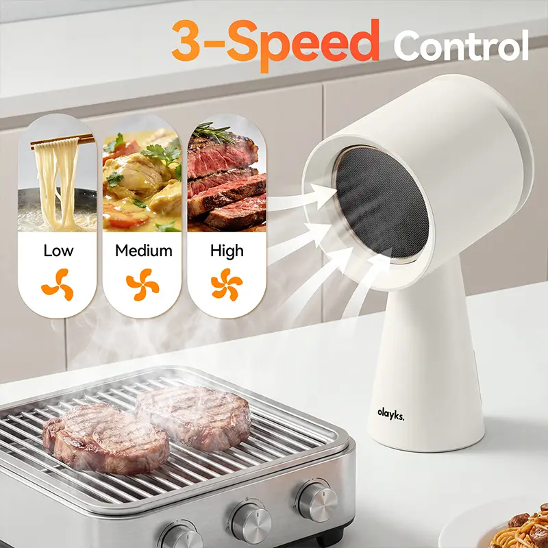 ·3-Speed Adjustable Fan: olayks portable desktop range hood can be adjusted with three levels of Low/Medium/High for everyday cooking. One-touch MAX mode delivers powerful 3m³/min airflow for intense smoke or strong smells—it automatically returns to previous speed after 1 minute so you don't have to