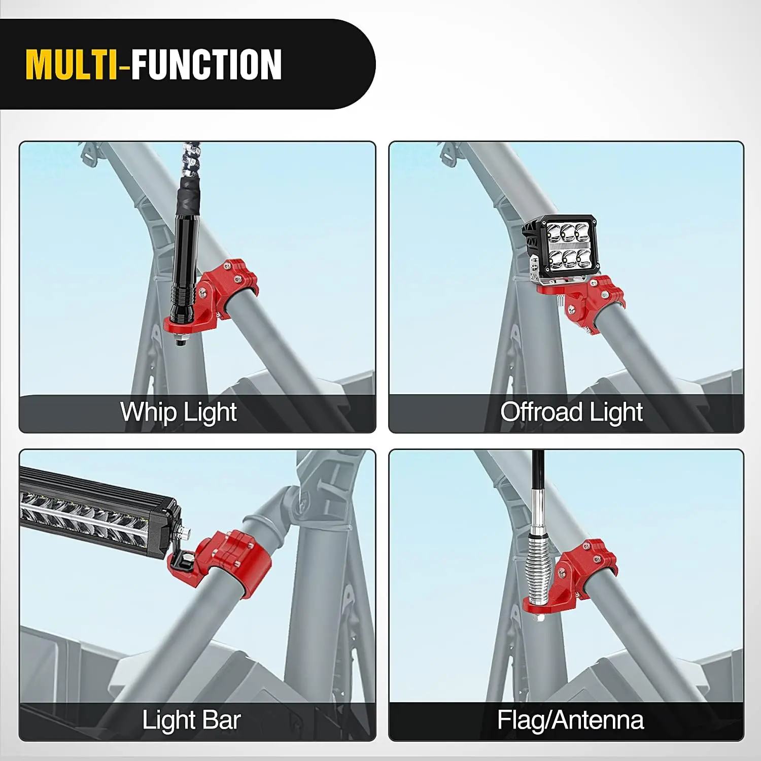 Ā·ćFit SizećSpecially designed for flag antenna whip mounts on all UTVs with 1.5 to 1.75 inch and 1.75 to 2 inch Round Roll Cages, such as: Polaris RZR, Ranger, Can-Am Maverick X3, Commander, Yamaha, Kawasaki, Honda Talon Pioneer, ect