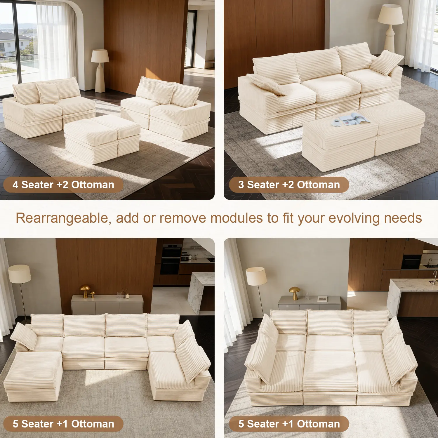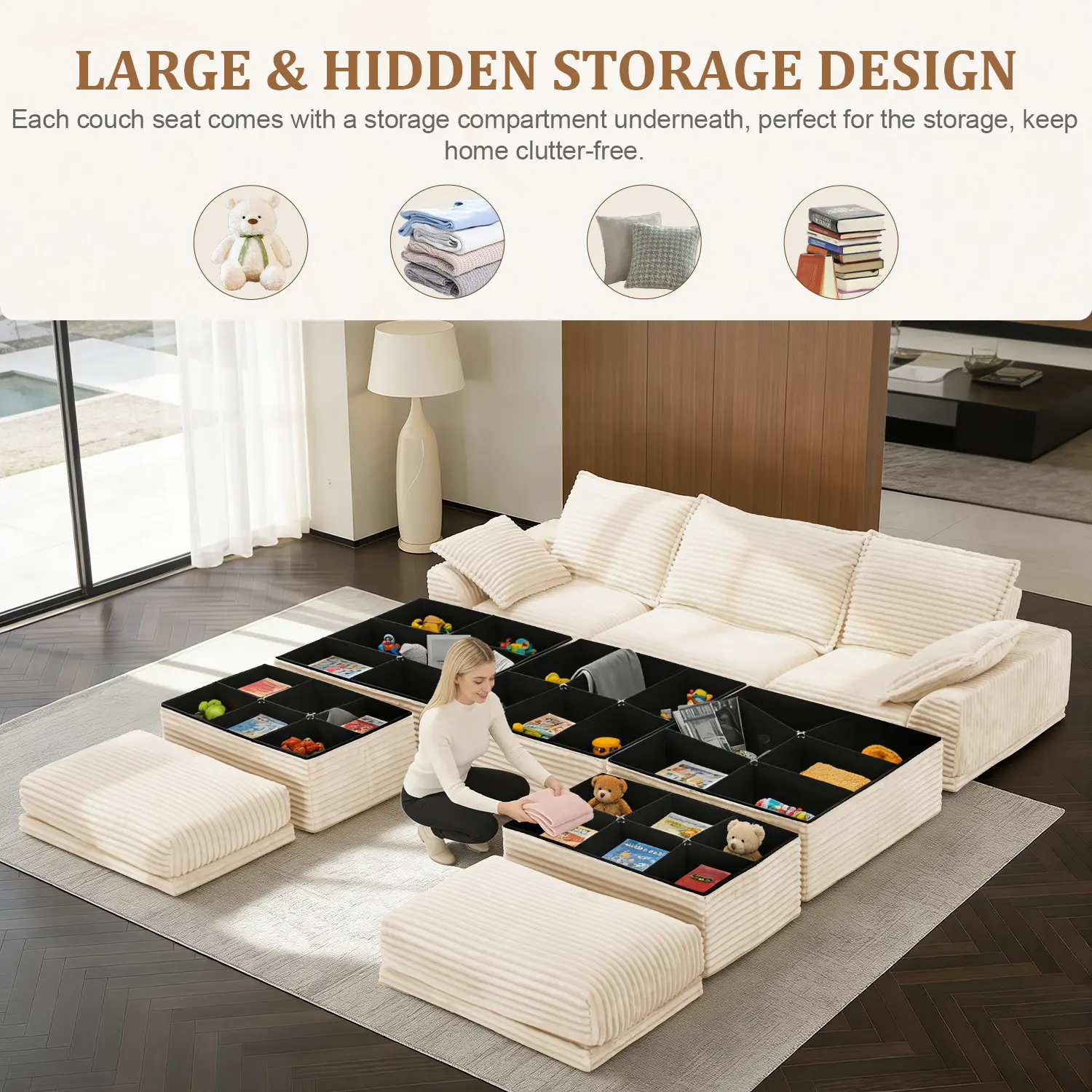 HIDDEN STORAGE UNDER EVERY SEAT: Maximize your space without sacrificing style. Unlike standard couches for living room, every single module and ottoman with storage in this set features a spacious, easy-to-access compartment. Instantly stash away blankets, toys, or pillows to keep your home perfectly organized and clutter-free