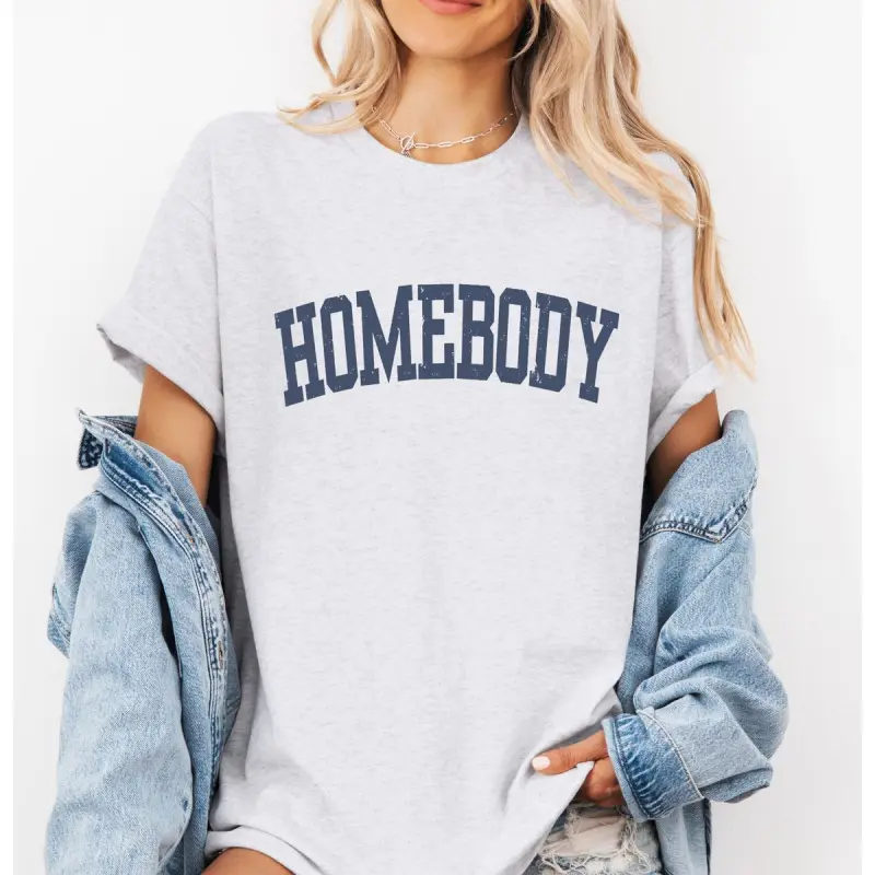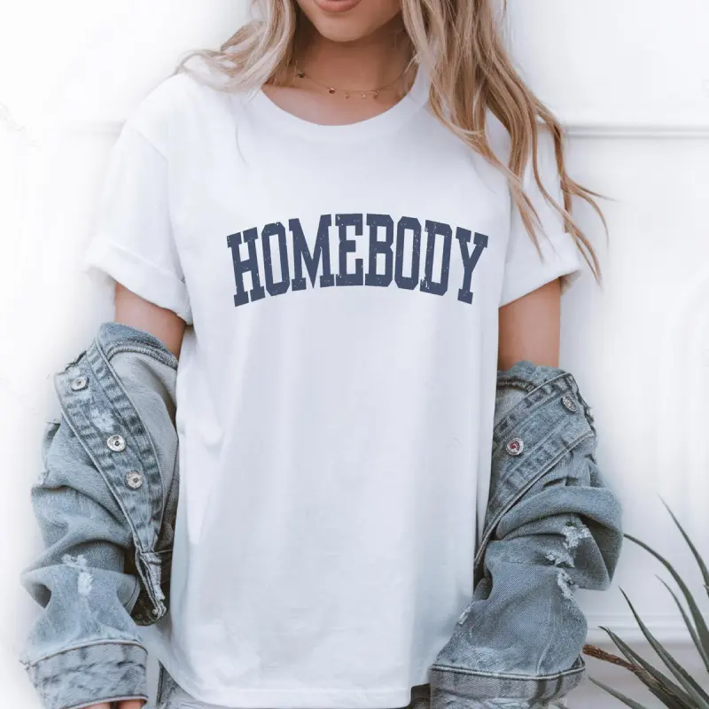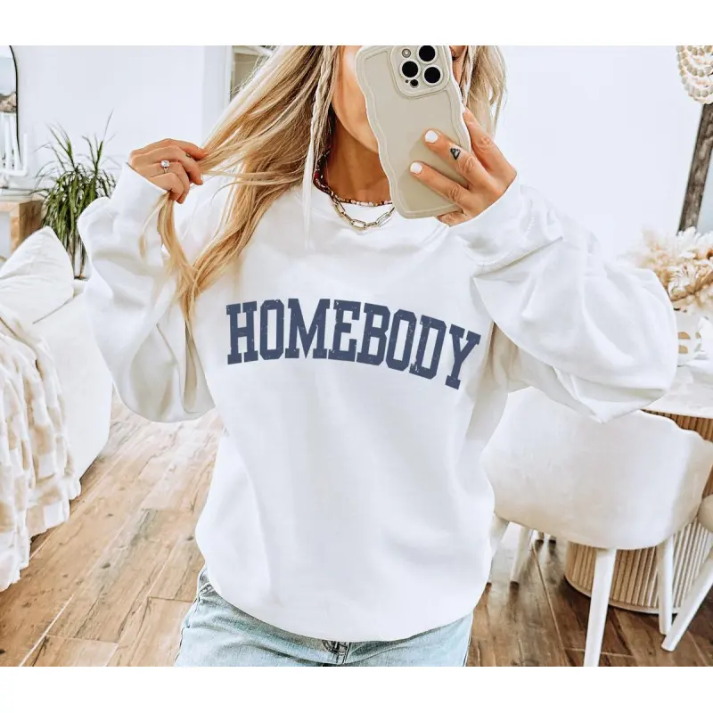 Cozy up in this stylish funny and sassy sweatshirt or T-shirt, perfect for those days when you just need a little extra comfort.Made from ultra-soft fabric, this shirt offers style and relaxation while showcasing your mood in a fun, laid-back way.The "homebody" college font graphic adds a touch of personality to your casual look.