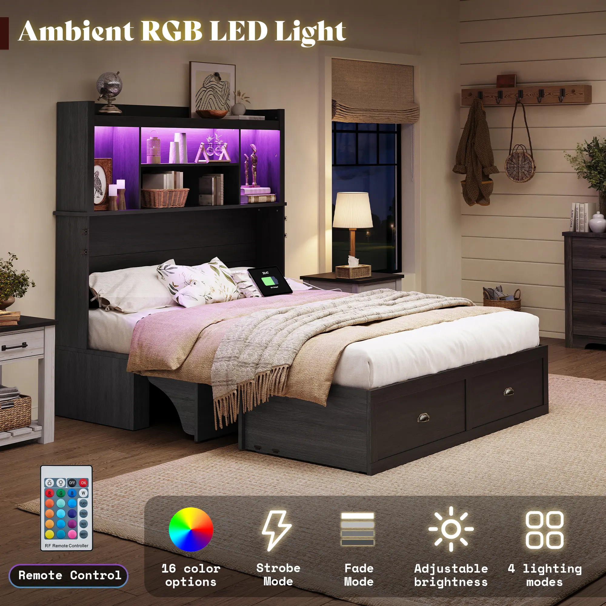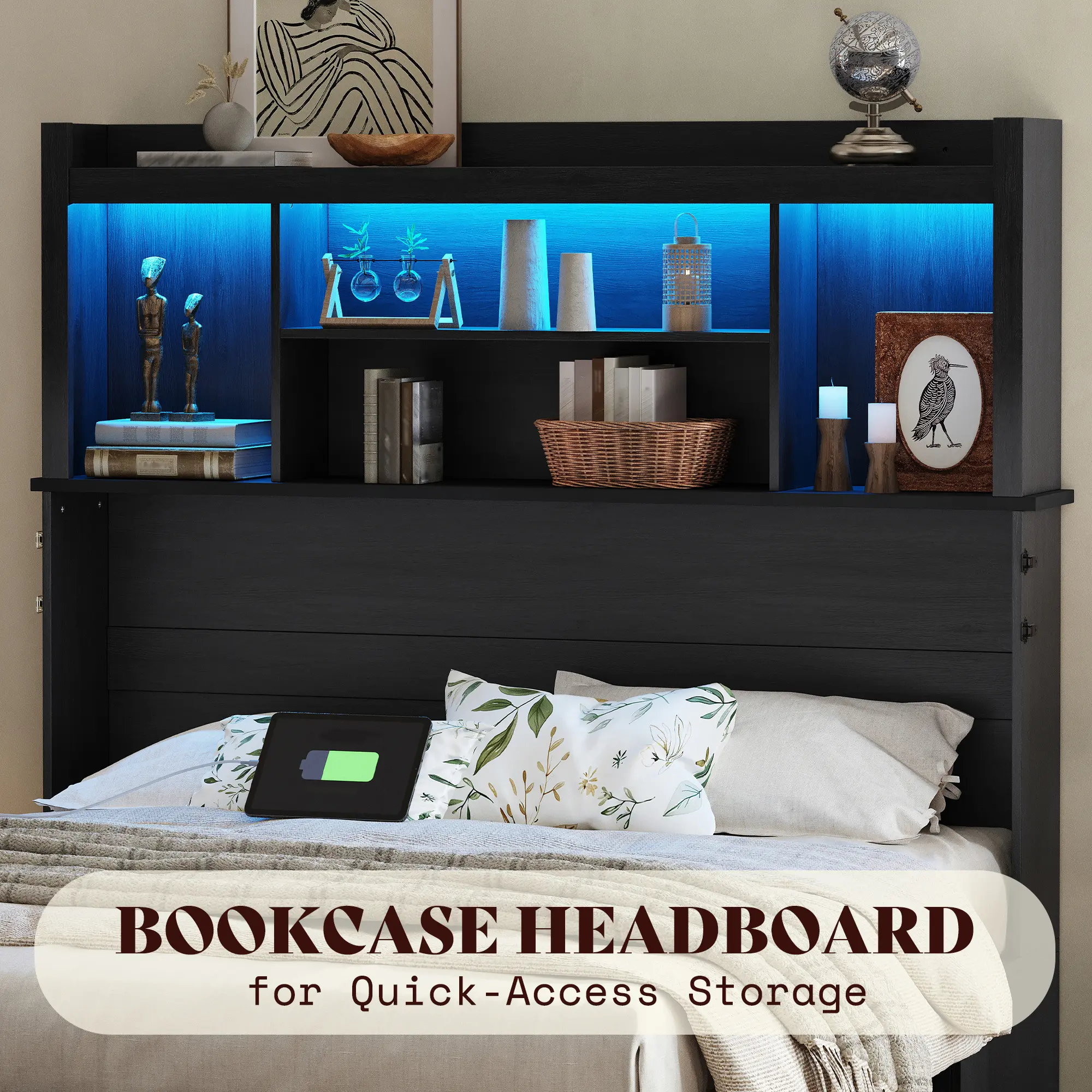 ·【LED Bookcase Headboard】Designed with 4 spacious open shelves to keep daily essentials neatly arranged and within reach, improving both function and display. Remote-controlled adjustable LED lighting provides subtle ambiance