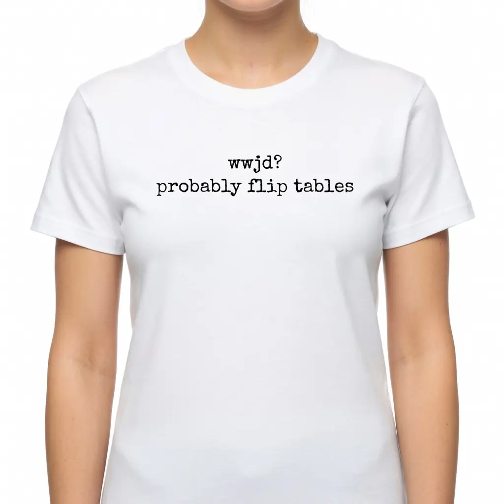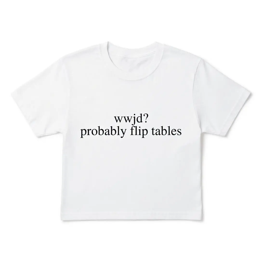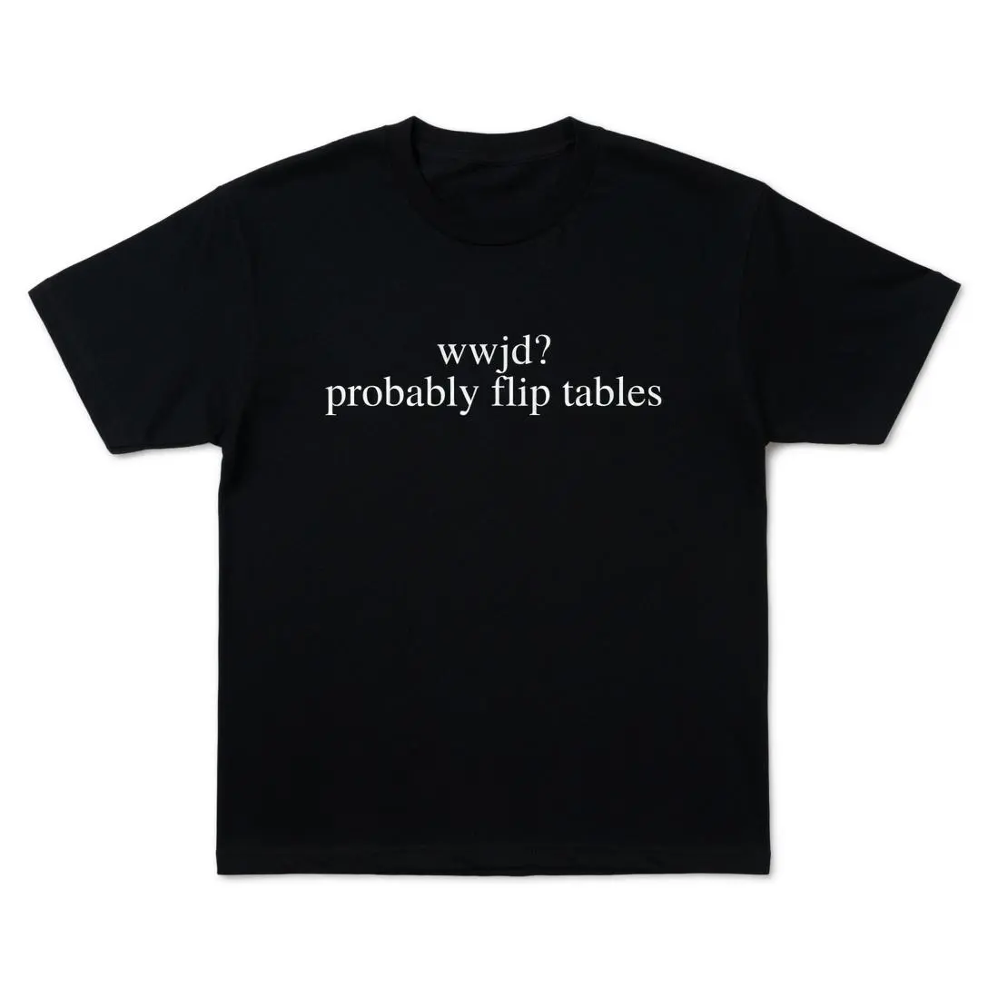 WWJD Probably Flip Tables Funny Christian T-Shirt, Sarcastic Jesus Graphic Tee, Faith Humor Short Sleeve Apparel, Aesthetic Religious Satire & Bible Verse Gift Fashion Top, Viral Trendy Church Culture Statement Streetwear Crew Neck