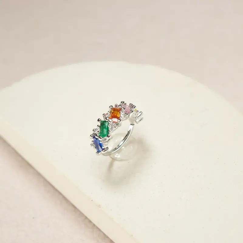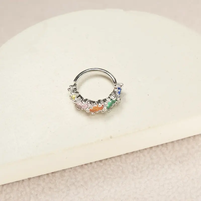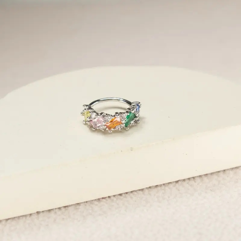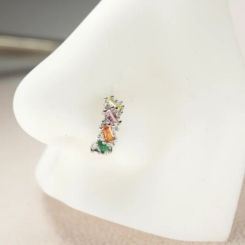 This silver nose hoop features precisely-set multicolor baguette cubic zirconia stones. Its clean curve and refined sparkle make it an elevated everyday piece for modern piercing lovers.