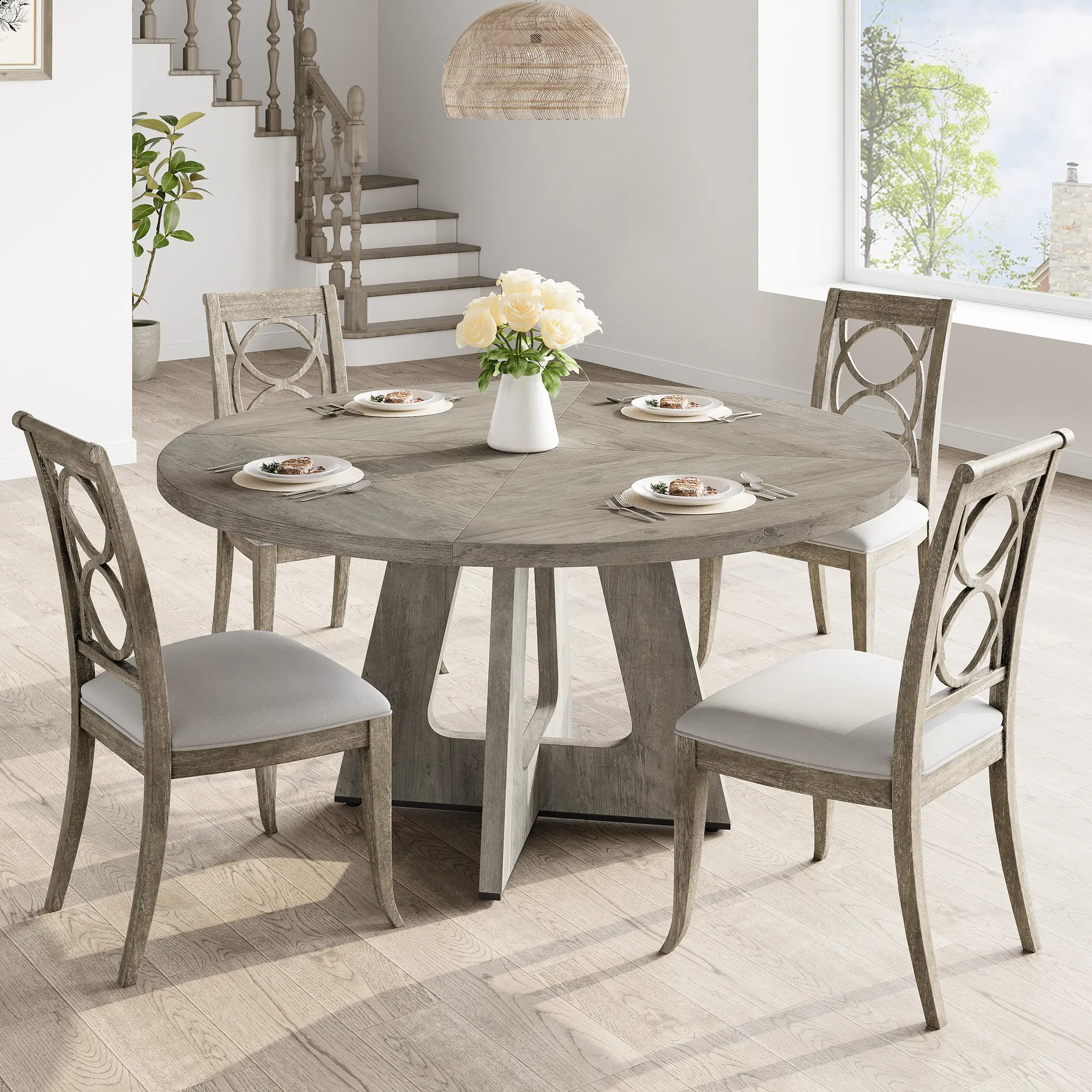 1.This round dining table boasts a classic design, from modern and contemporary to rustic and farmhouse. The smooth, rounded edges create a warm and inviting atmosphere, making it an ideal centerpiece for any dining area.