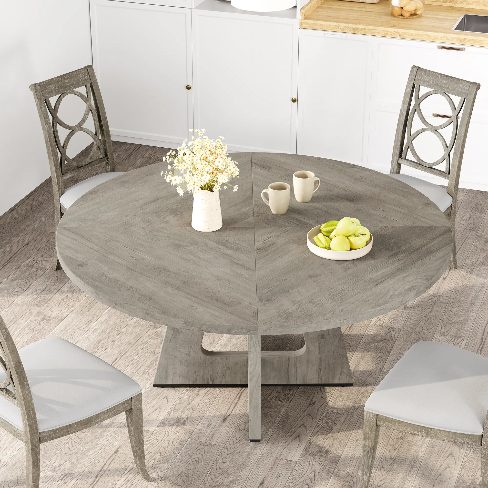 3.Measuring 47'' in diameter, this dining room table is perfectly sized for intimate dinners or larger gatherings. Comfortably seating 4-6 people.