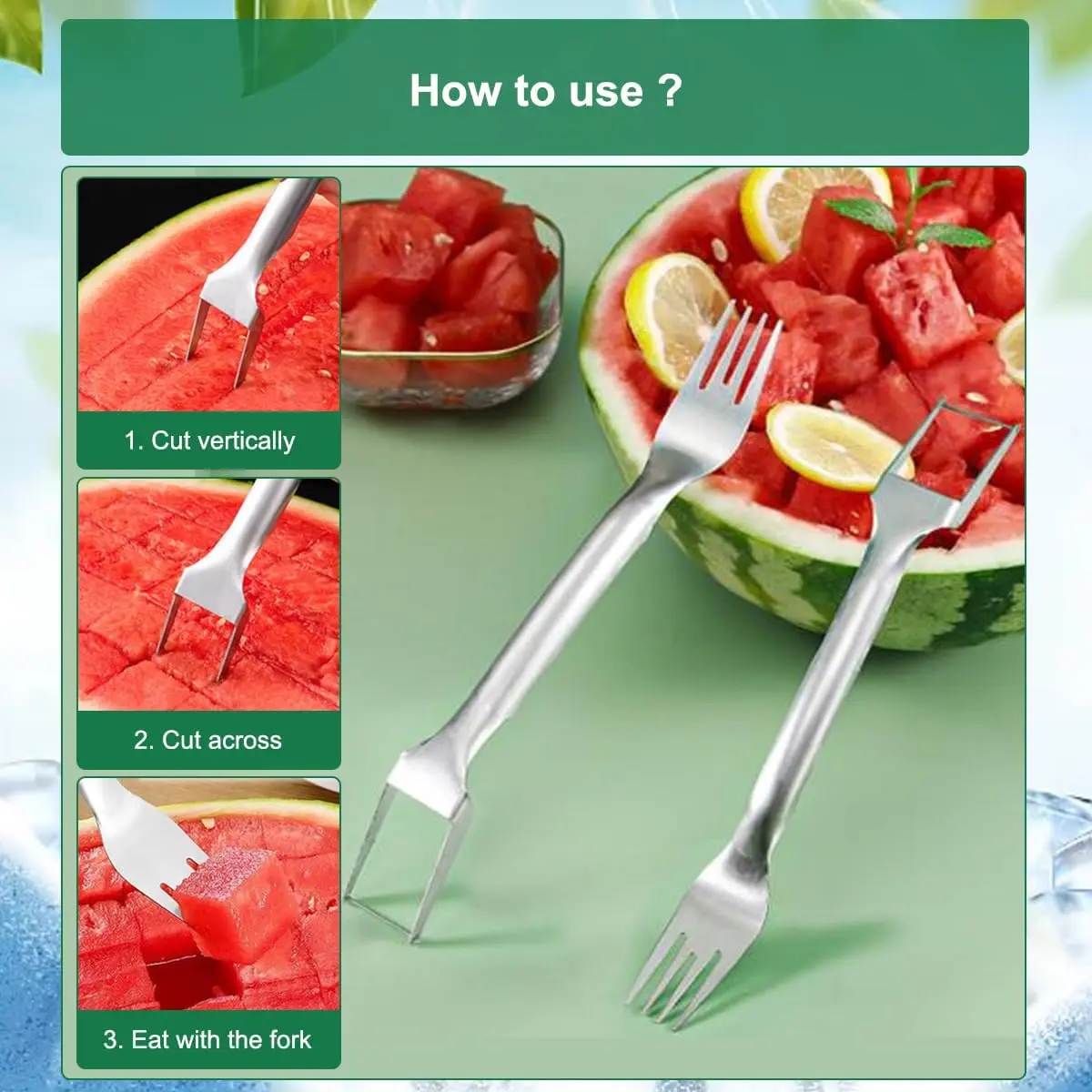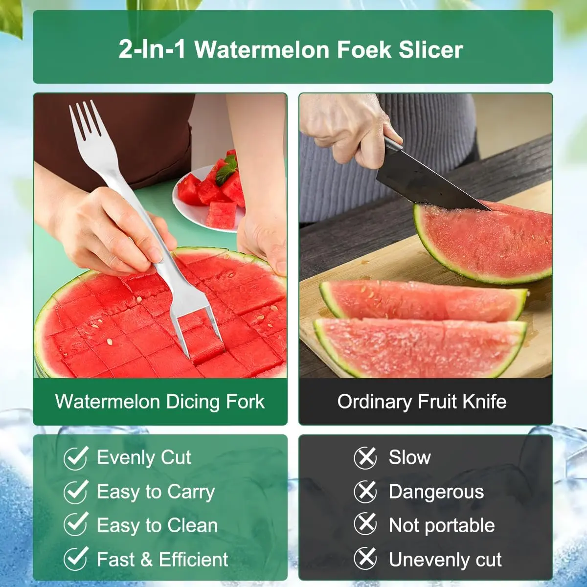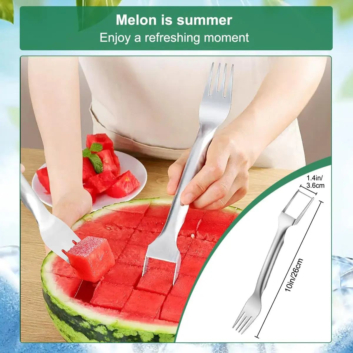2-in-1 design, allow you to cut perfect watermelon cubes quickly and safely, then you can use the fork side to fork it out. Its hollow handle can avoid your hand from getting wet.