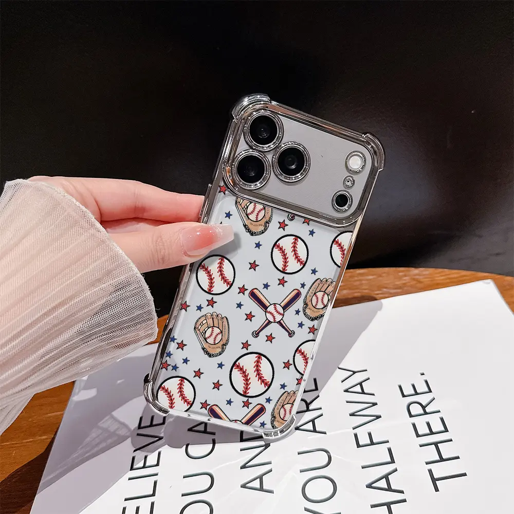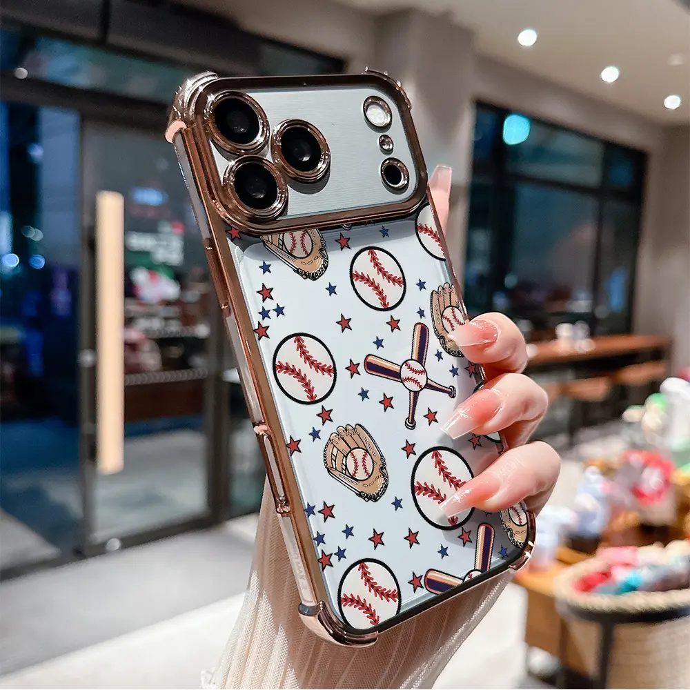 5. Phone Case for iPhone 17 Pro Max Air 16 15 14 13 12 11 Plus Baseball.Baseball gloves Pattern Four Corner Anti-Fall Phone Case Transparent Electroplated Protective Cover