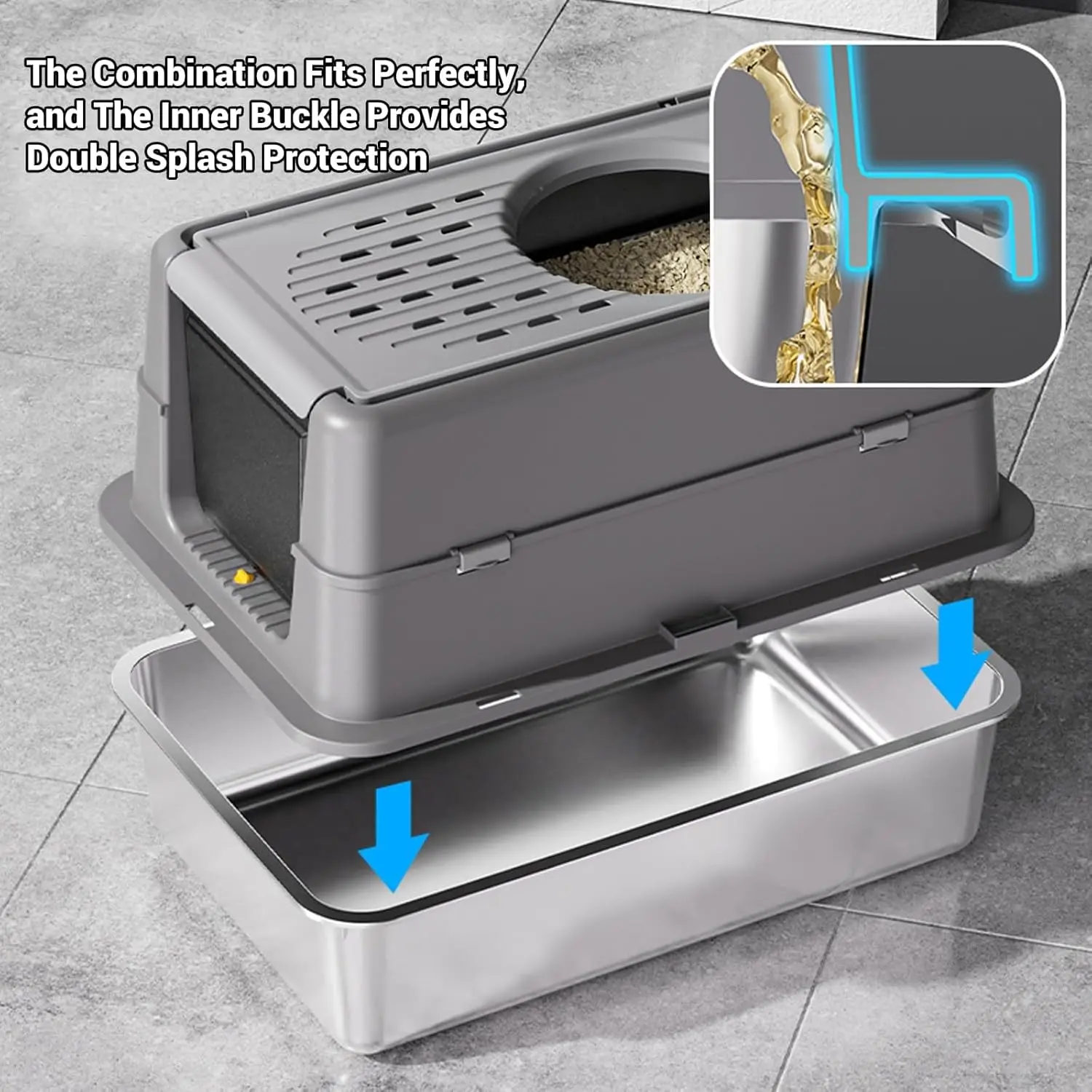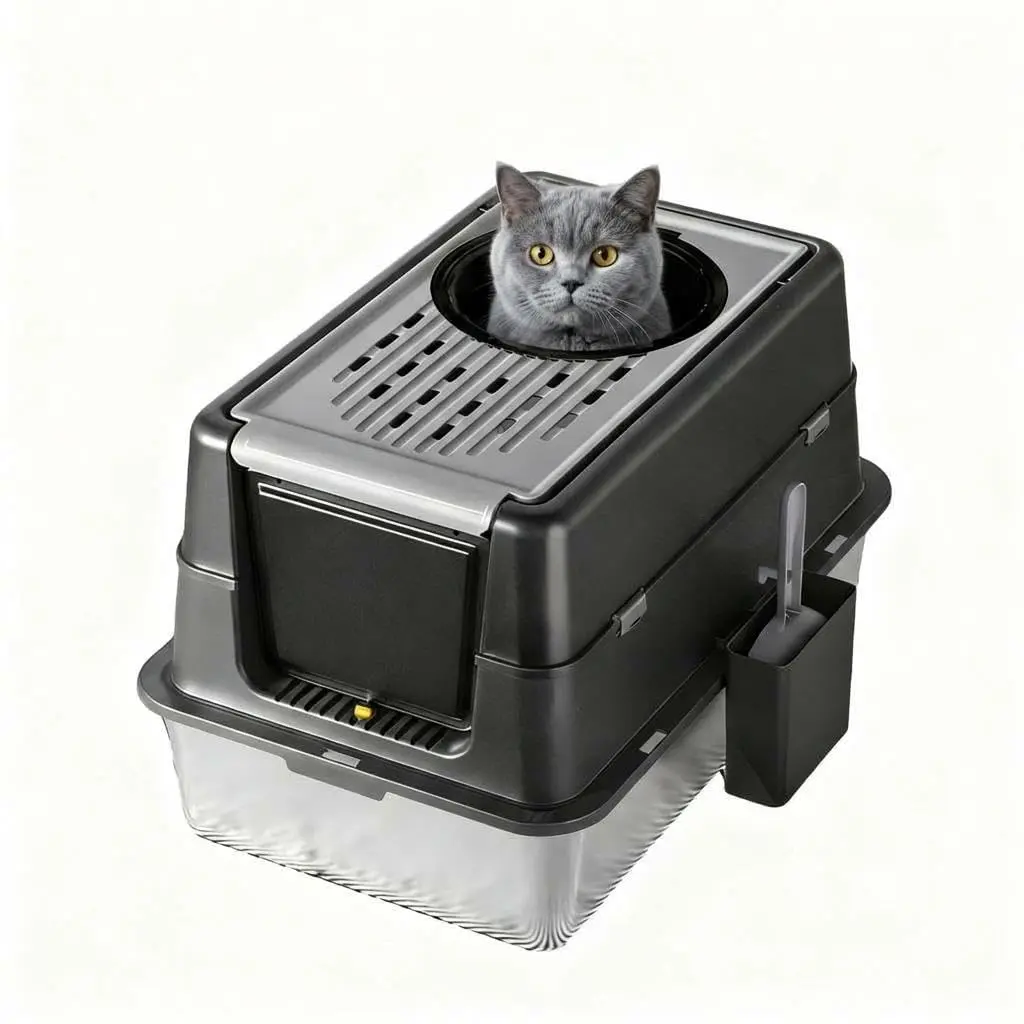 Picture your multi-cat home.Your Maine Coon prefers the front door, stepping in quietly. Your younger cat jumps in from the top, landing softly on the litter. The enclosed design keeps smells contained, and the stainless steel surface won't absorb odors. When it's time to clean, you flip the entire top open 180°, scoop in seconds, and close it back up. No dismantling, no scrubbing—just fresh, clean litter. The result? A happier home, healthier cats, and less work for you.