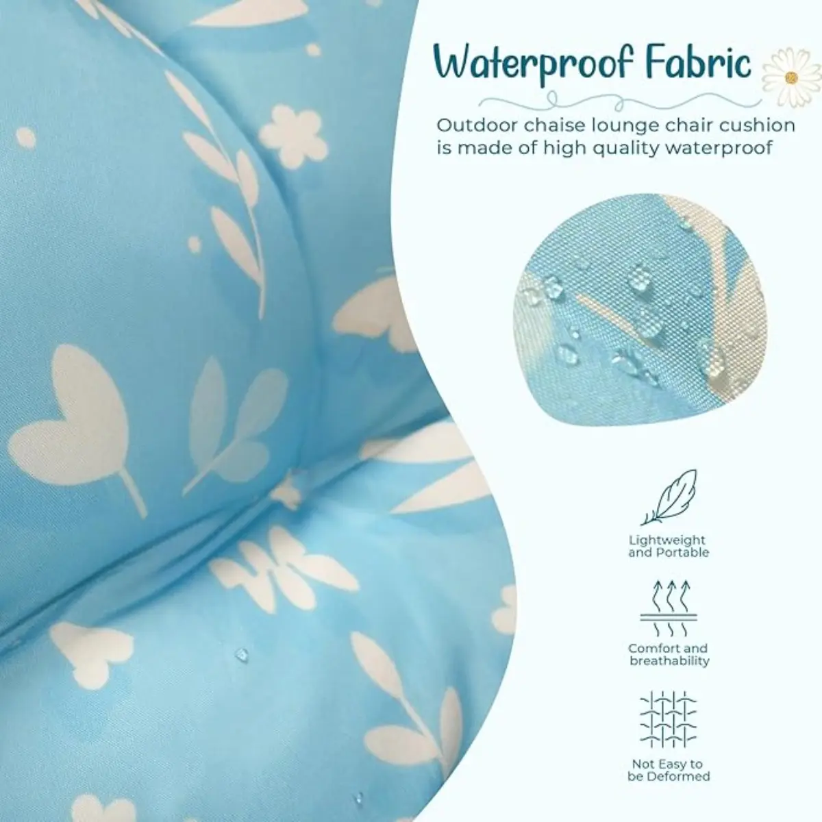 ·Upgrade Design: Our waterproof outdoor lounge chair cushion is designed with non-slip particles and anti-slip back cover on the back, and the extra 2 straps can fix the outdoor chaise lounge cushion firmly on the lounge chair. The designer's specially designed pattern to match the style of the patio uses 3D printing technology
