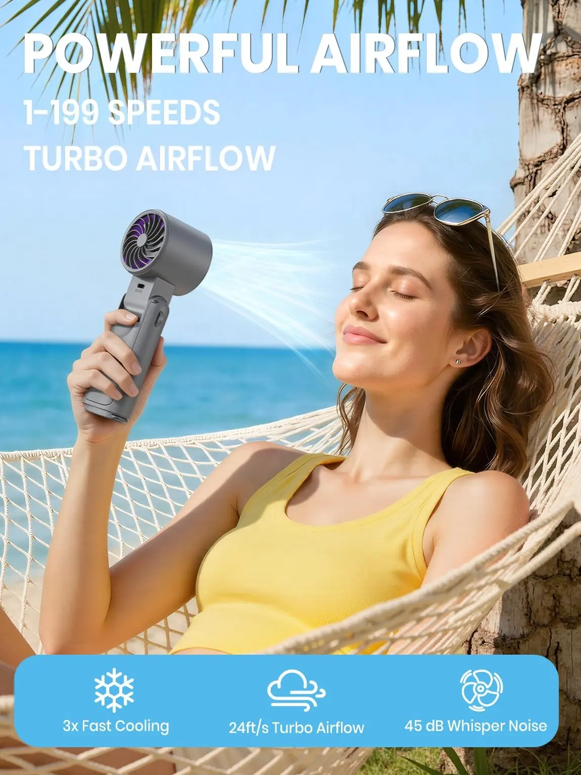 【Powerful Turbo Airflow】Experience instant cooling with a high-velocity 10,000+ RPM motor and 24 ft/s wind speed. It delivers powerful wind, and its advanced engineering ensures maximum airflow, making it ideal for keeping you cool on hot summer days. Strong wind, low noise—no worries!