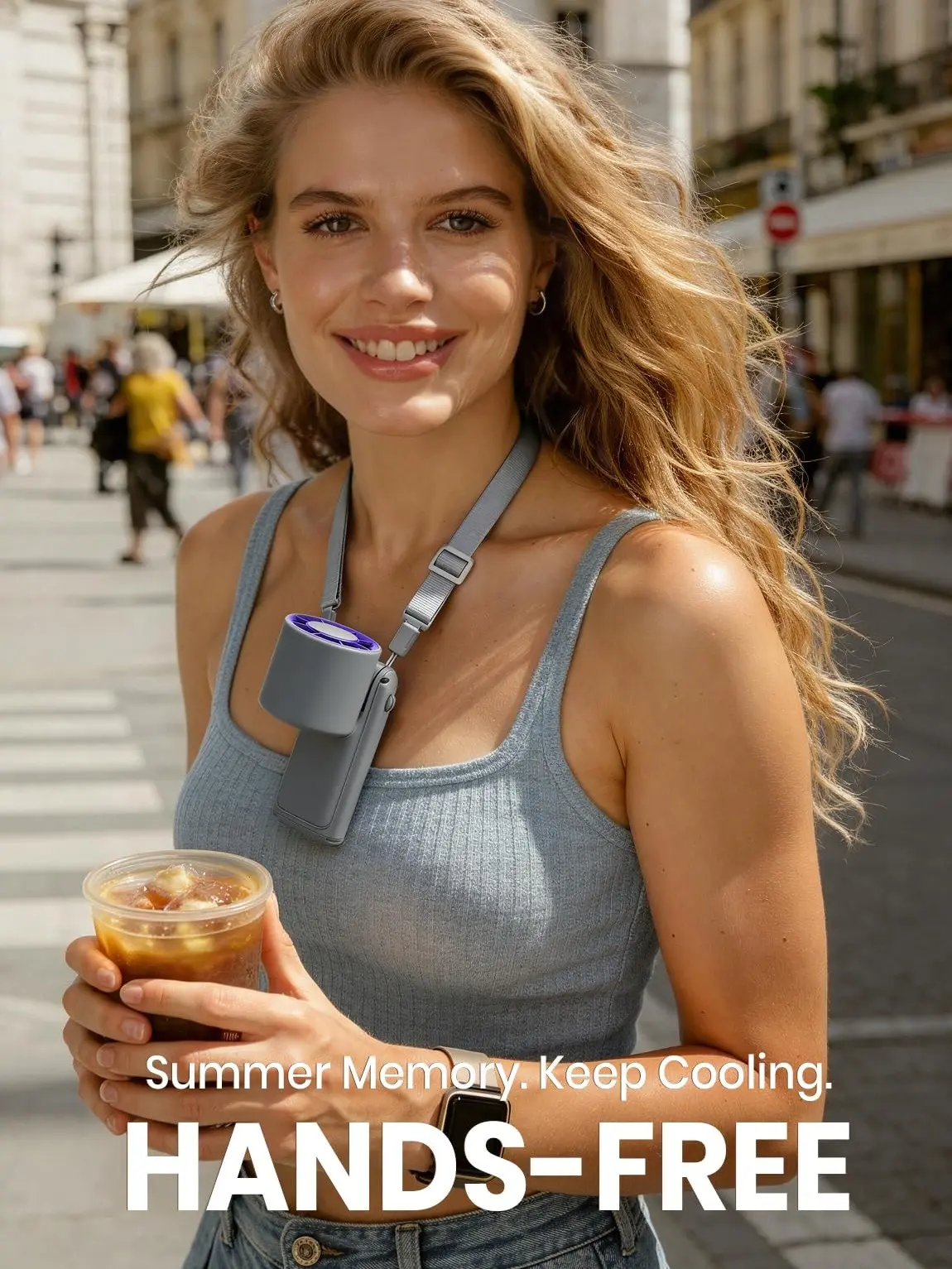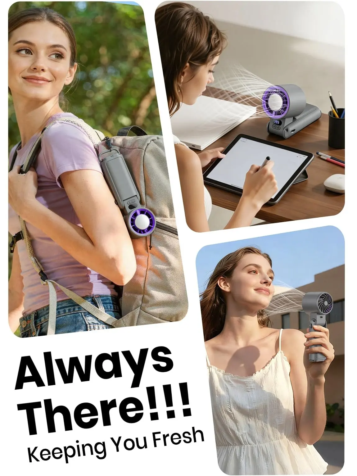 【4-in-1 Versatile Design】Not just a portable handheld fan. Paired with a lanyard, it can be easily hung around the neck, or secured to a backpack or belt loop using the built-in carabiner clip. It can be also folded and placed on a table. This hands-free fan fits all scenarios perfectly.